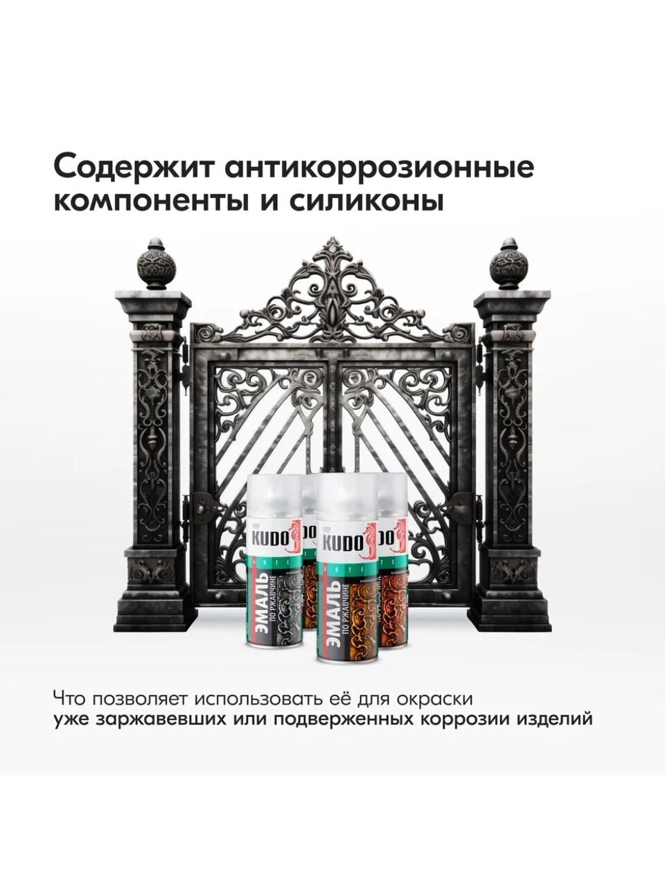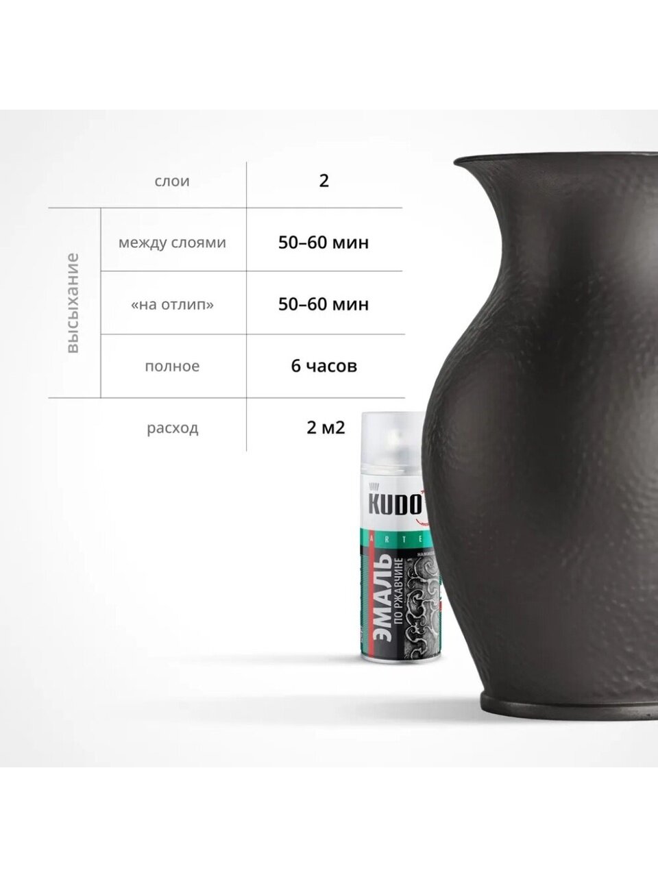 Высококачественная алкидная аэрозольная молотковая эмаль в баллончике KUDO предназначена для окраски уже заржавевших или подверженных коррозии изделий из сплавов черных металлов, а также для декоративной окраски предварительно загрунтованных деревянных, пластиковых и других поверхностей.