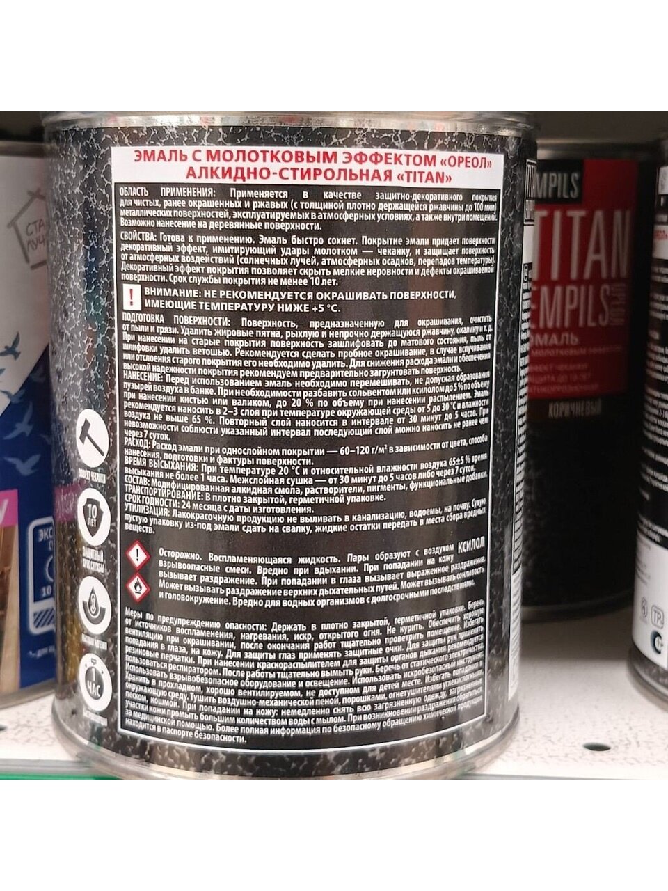 Вы можете приобрести «Эмаль Ореол, Titan, с молотковым эффектом, алкидно-стирольная, коричневая, 0.8 кг» и другие товары в нашем интернет-магазине в Астрахани по низким ценам и с бесплатным самовывозом.