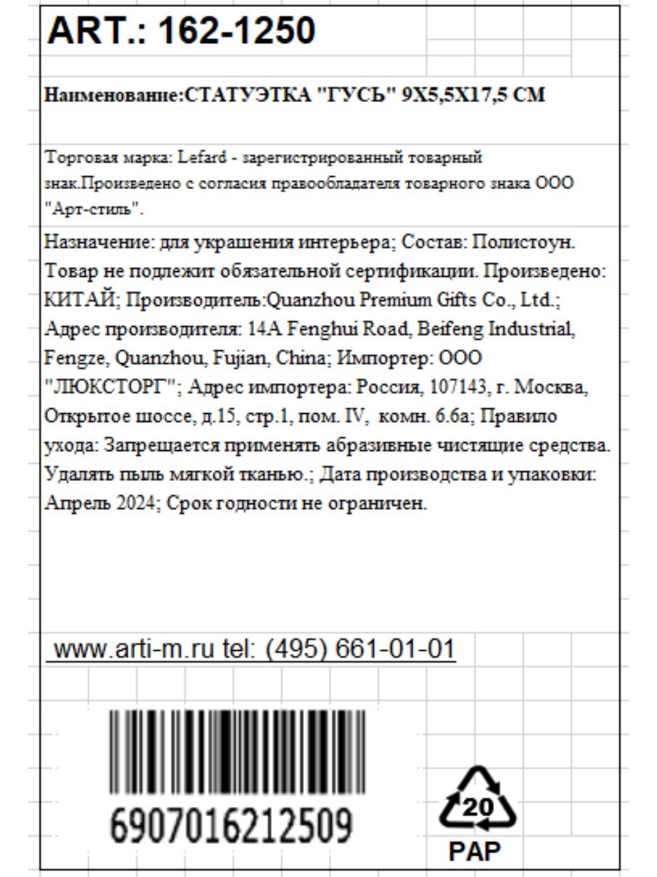Вы можете приобрести «Статуэтка полистоун, Гусь, 9х5.5х17.5 см, Lefard, 162-1250» и другие товары в нашем интернет-магазине в Орле по низким ценам и с бесплатным самовывозом.