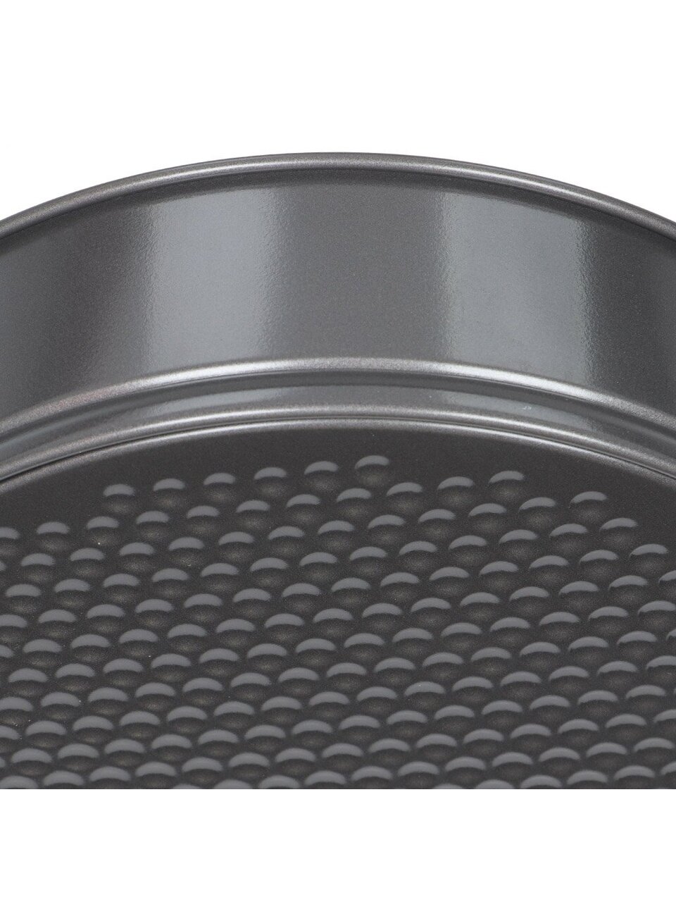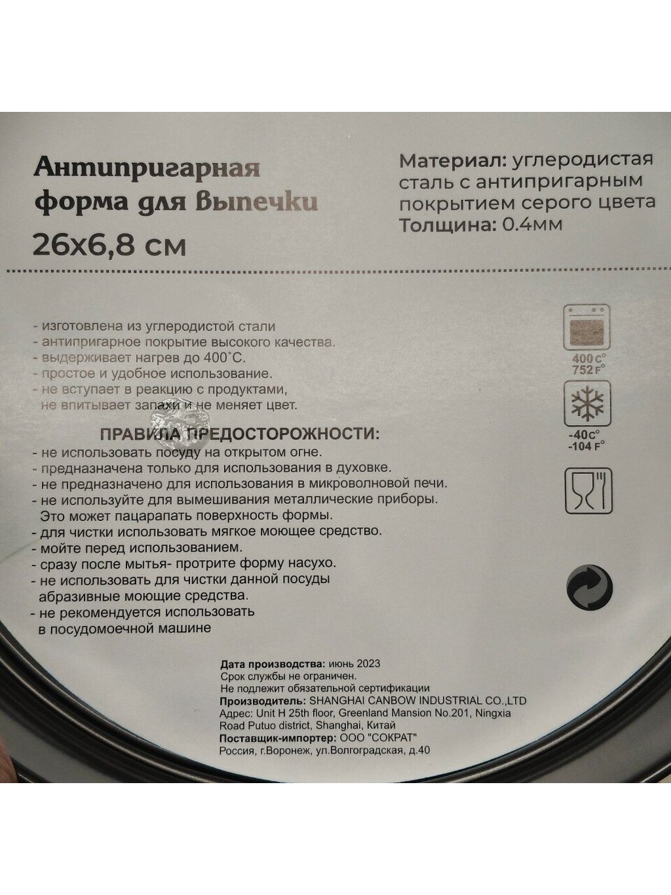 Диаметр формы — 26 см, высота — 6.8 см. Круглая разъемная конструкция и съемное дно обеспечивают удобство извлечения выпечки.