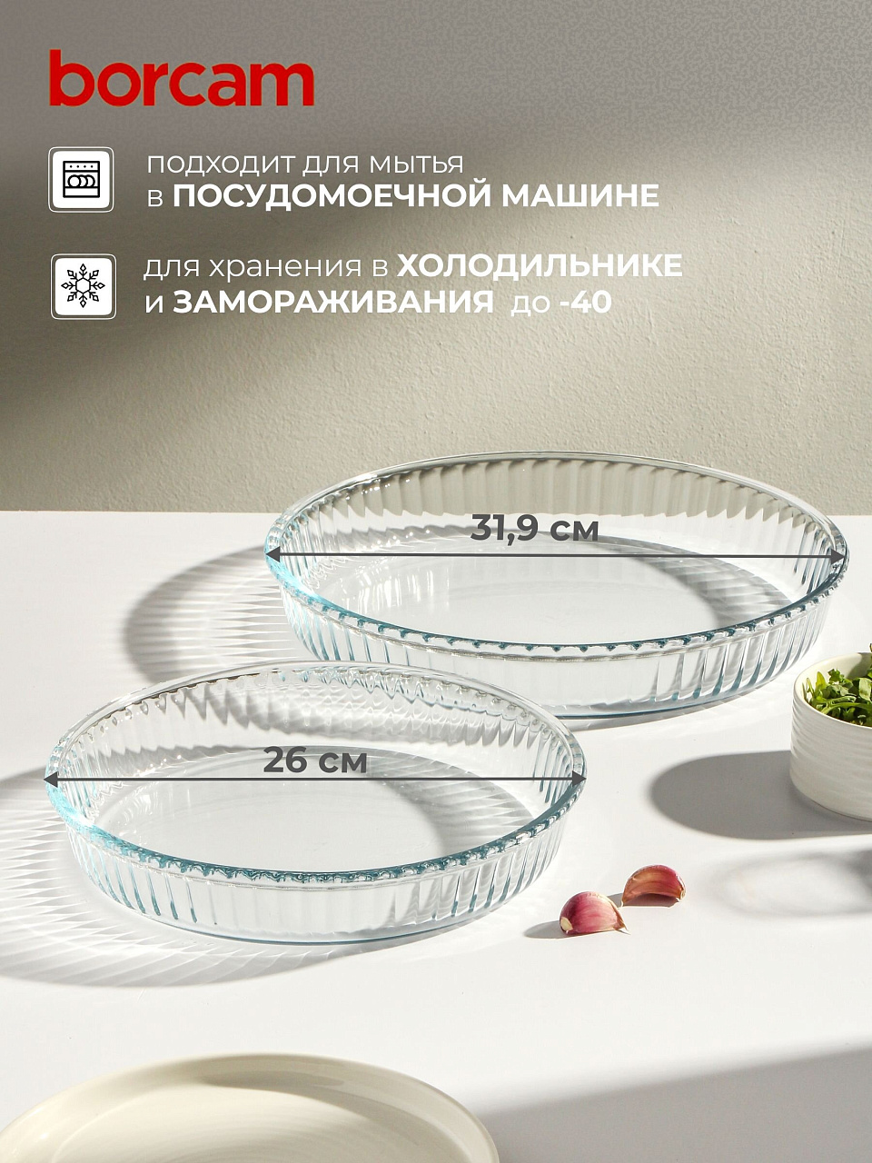 - Жаропрочное стекло Borcam — сохраняет вкус и натуральность блюд, подходит для микроволновки и духовки