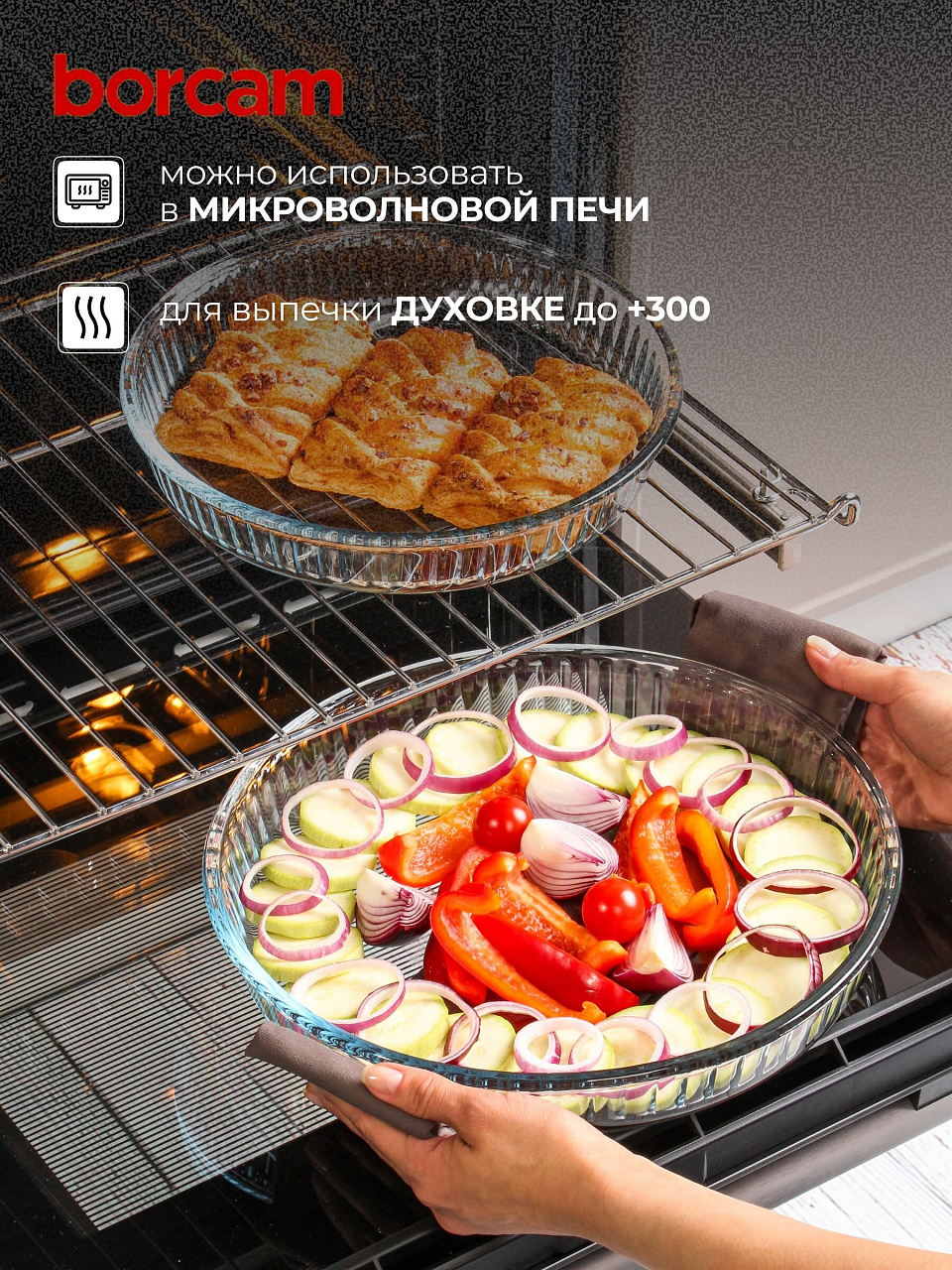 Да, обе формы из жаропрочного стекла Borcam подходят для использования в духовке и СВЧ. Они выдерживают высокие температуры, не трескаются и не деформируются.