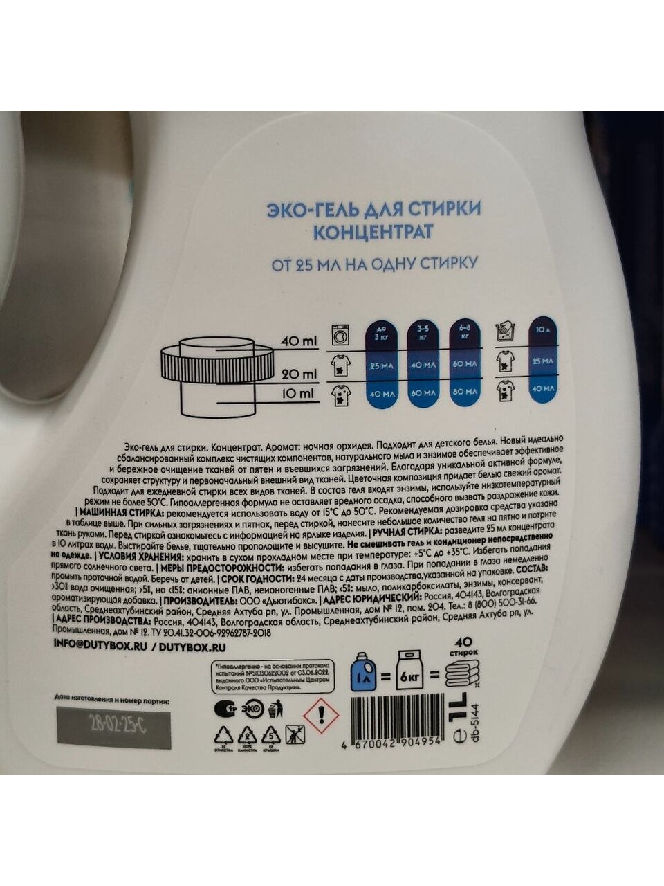 Погрузитесь в мир чистоты и свежести с гелем для стирки Dutybox, объемом 1 литр. Универсальный и гипоаллергенный, он станет идеальным выбором для заботы о вещах всей семьи. Аромат ночной орхидеи подарит вашему белью утонченную свежесть, наполняя дом нежным цветочным благоуханием.
