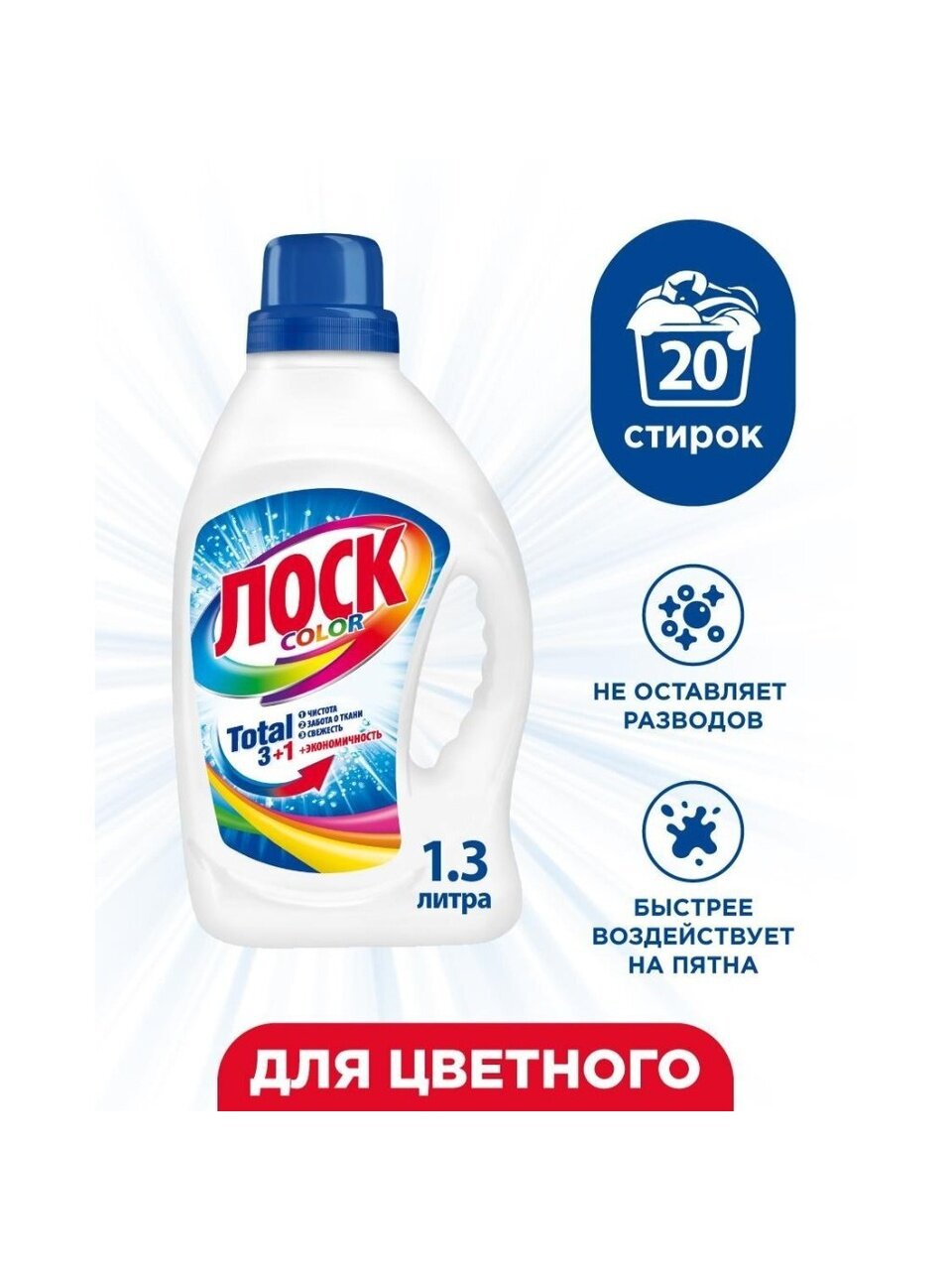 Жидкие средства для стирки Лоск Color с формулой Total 3+1 - последнее поколение средств для стирки Лоск, содержащих компоненты, которые эффективно справляются с различными видами загрязнений и обеспечивают заботу о ткани. Результат стирки - чистота и свежесть ваших вещей по разумной цене!