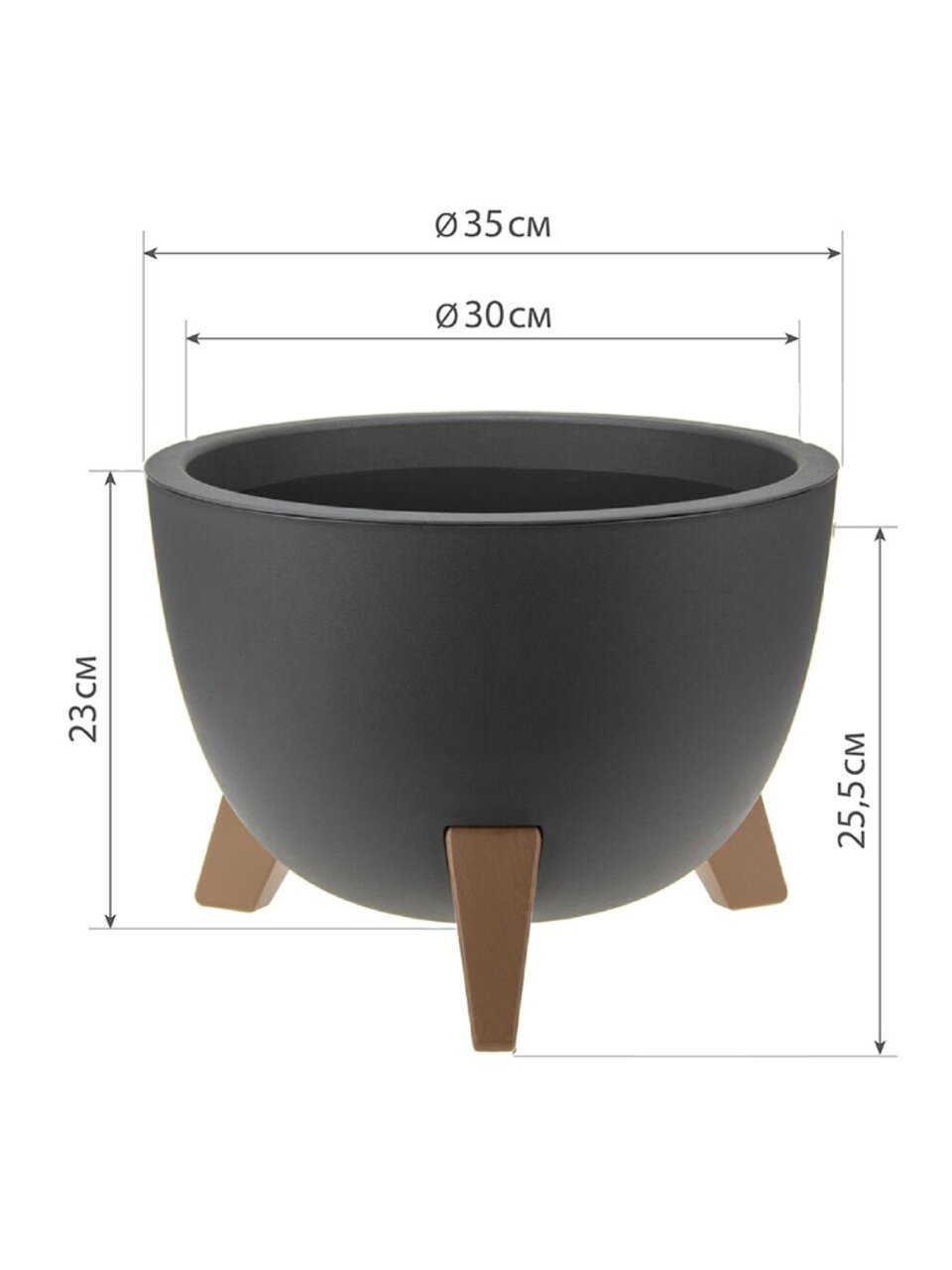 Кашпо со вставкой на ножках имеет круглую форму и матовую поверхность.