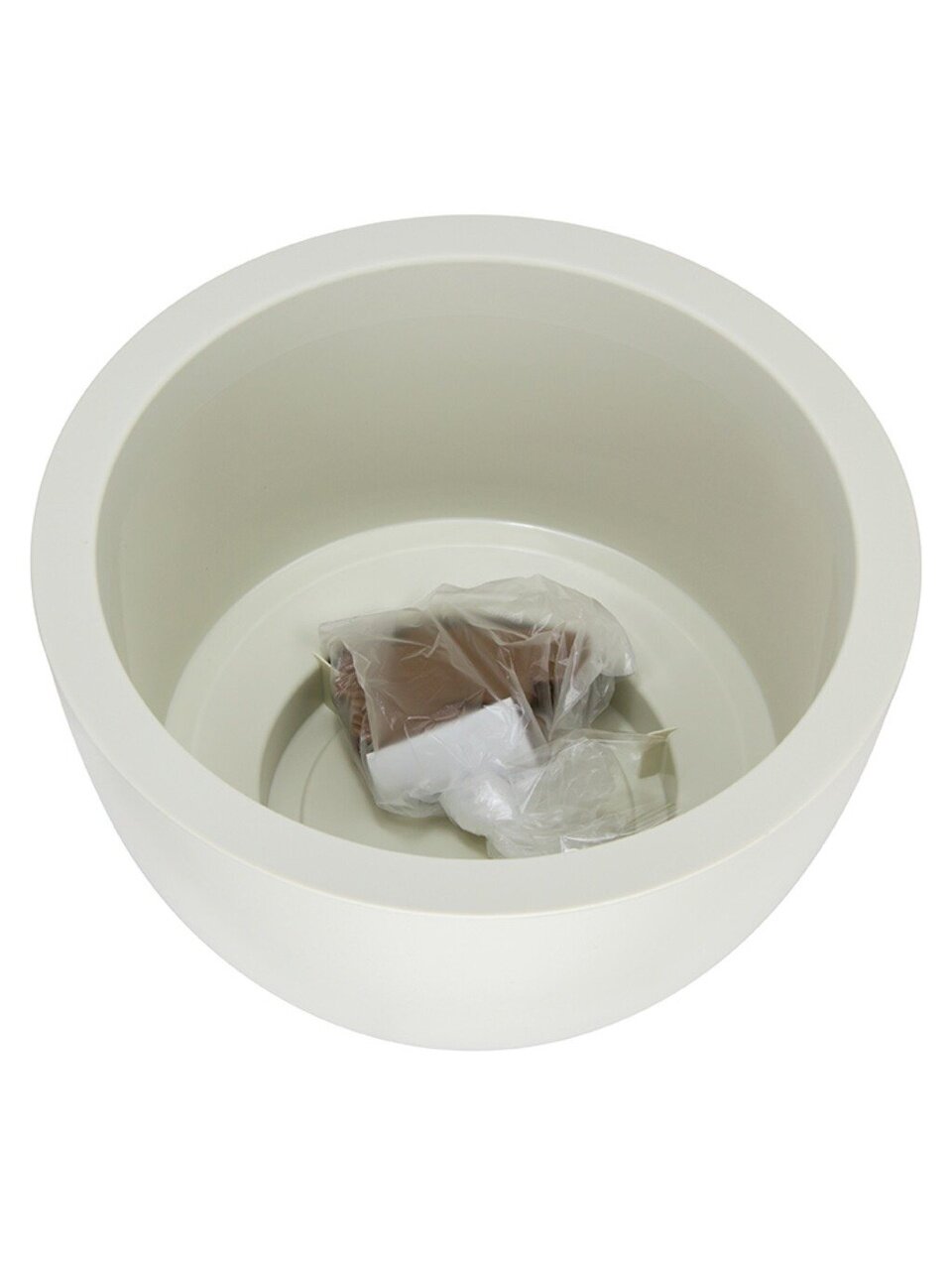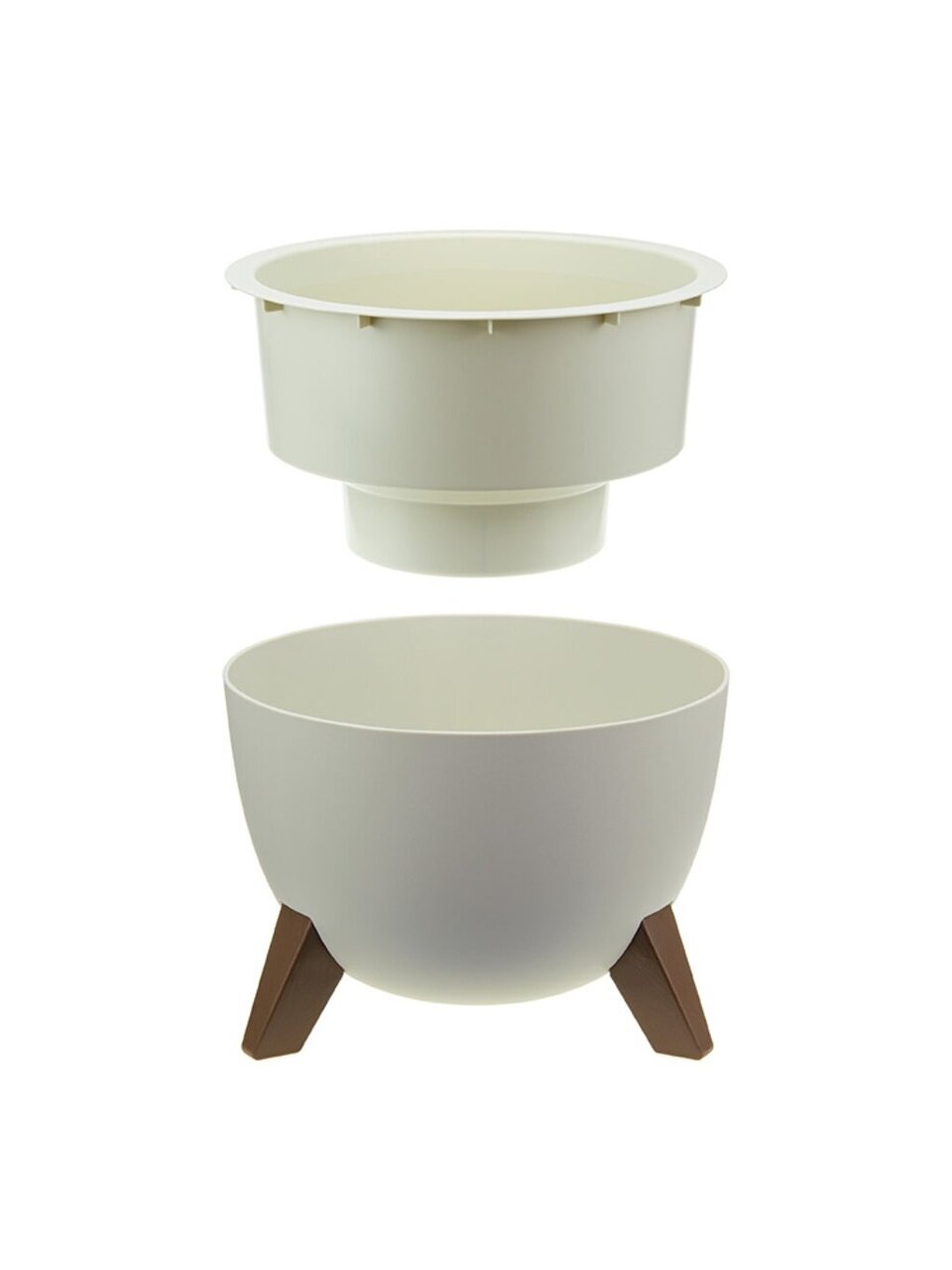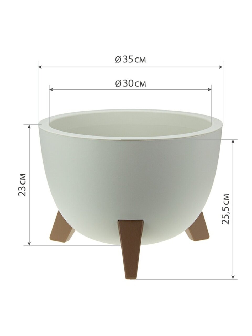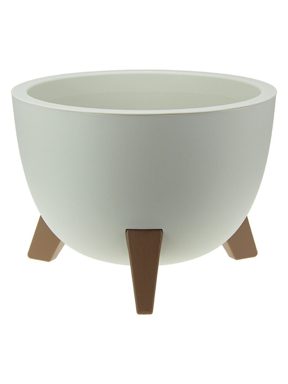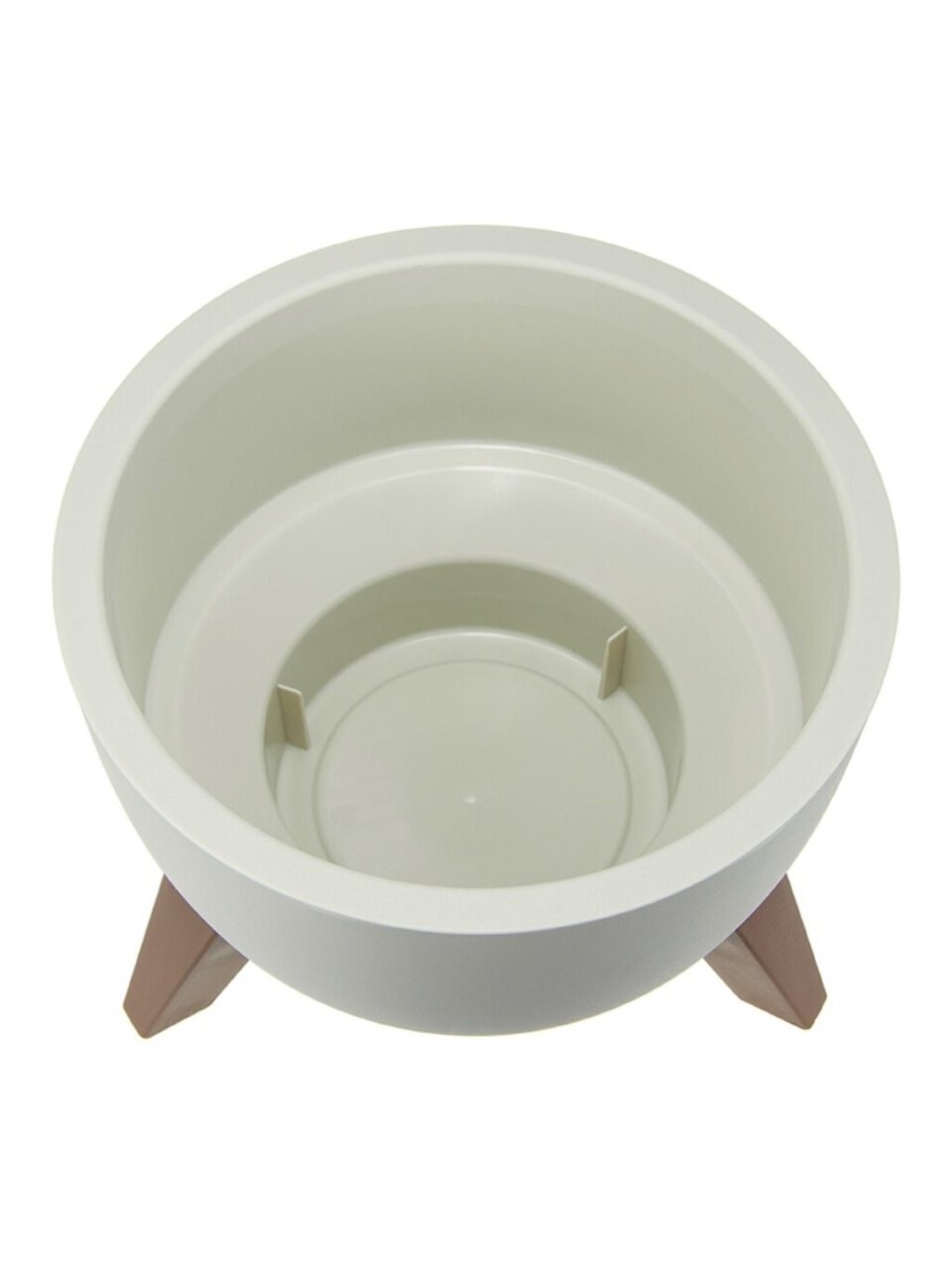Кашпо со вставкой на ножках имеет круглую форму и матовую поверхность.