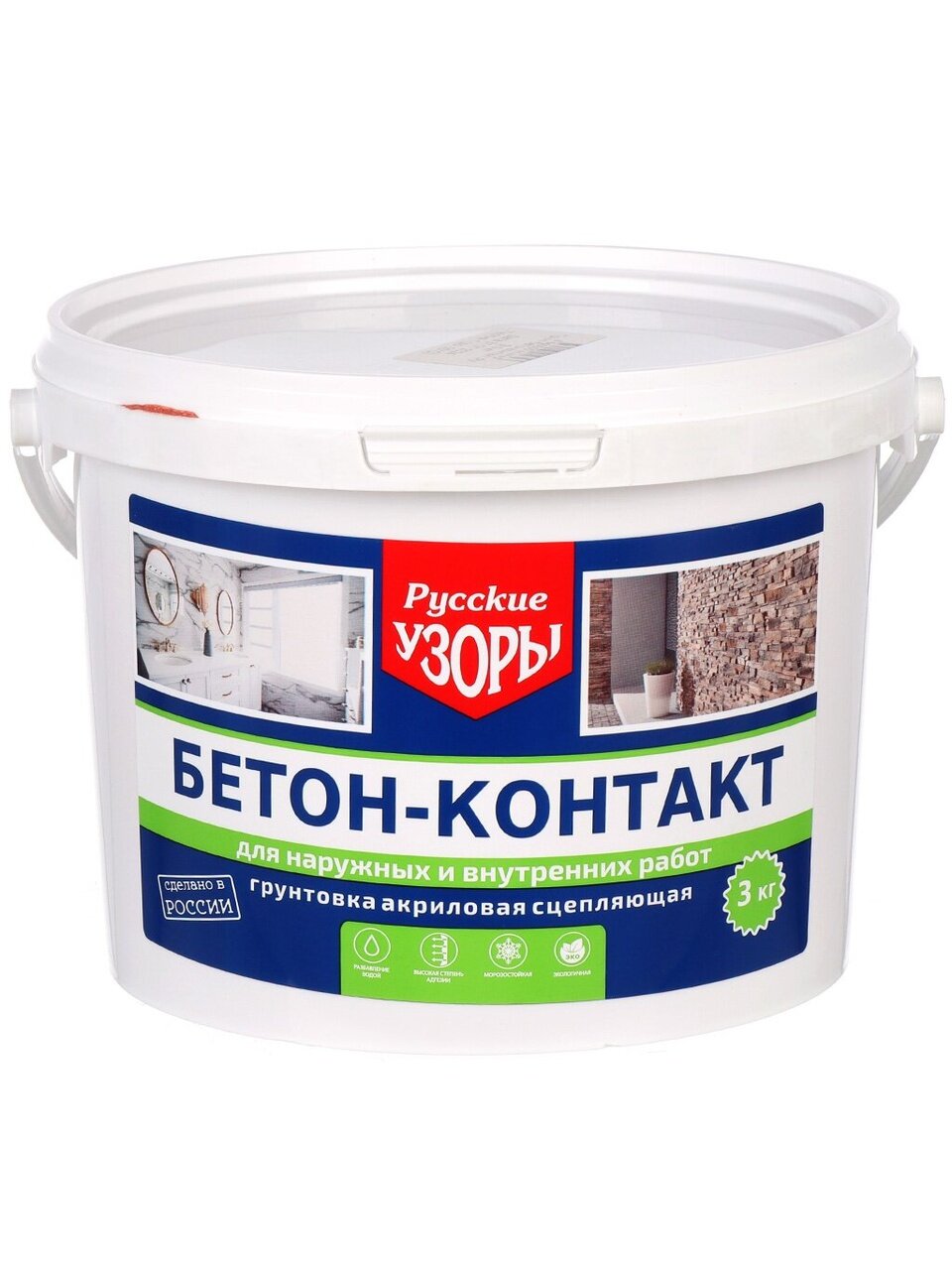 Грунтовка для наружных и внутренних работ на основе акриловых полимеров Русские узоры - готовая к применению адгезионная грунтовка для работ по бетону. За счет объемного наполнителя, после высыхания, создает шероховатую поверхность, чтобы на бетон можно было наносить последующую отделку. Используется перед нанесением штукатурок и шпатлевок на цементной и гипсовой основах, плиточного клея.