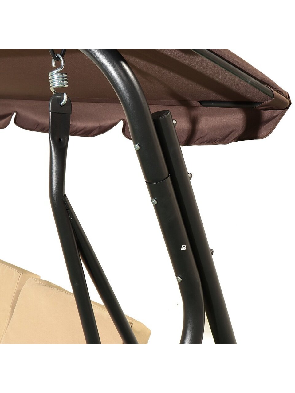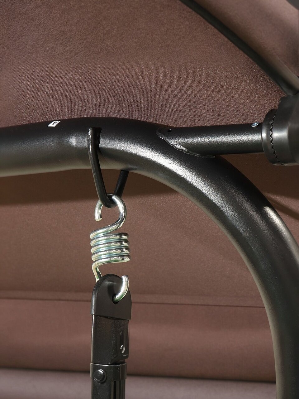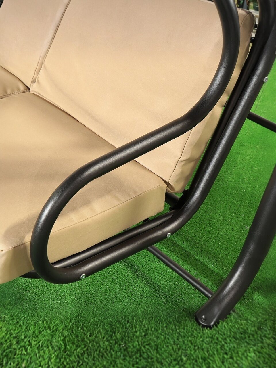 Сочетание бежевого цвета и коричневой крыши придает качелям изысканный вид, который легко впишется в любой ландшафтный дизайн. Металлический каркас обеспечивает надежность и долговечность конструкции, а мягкое сиденье из полиэстера с наполнителем толщиной 6 см гарантирует комфорт даже при длительном использовании.