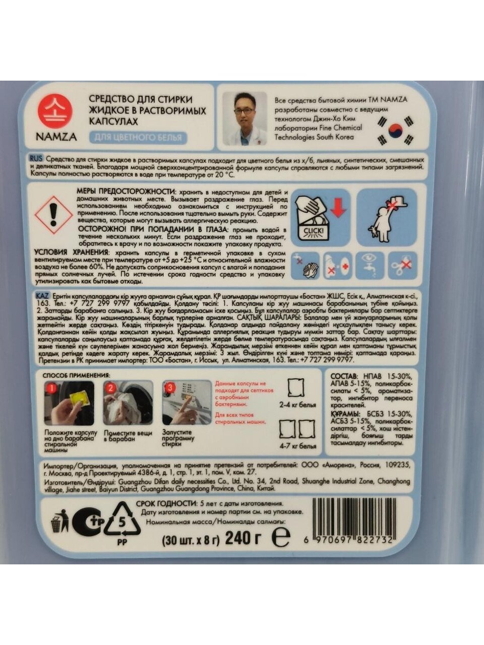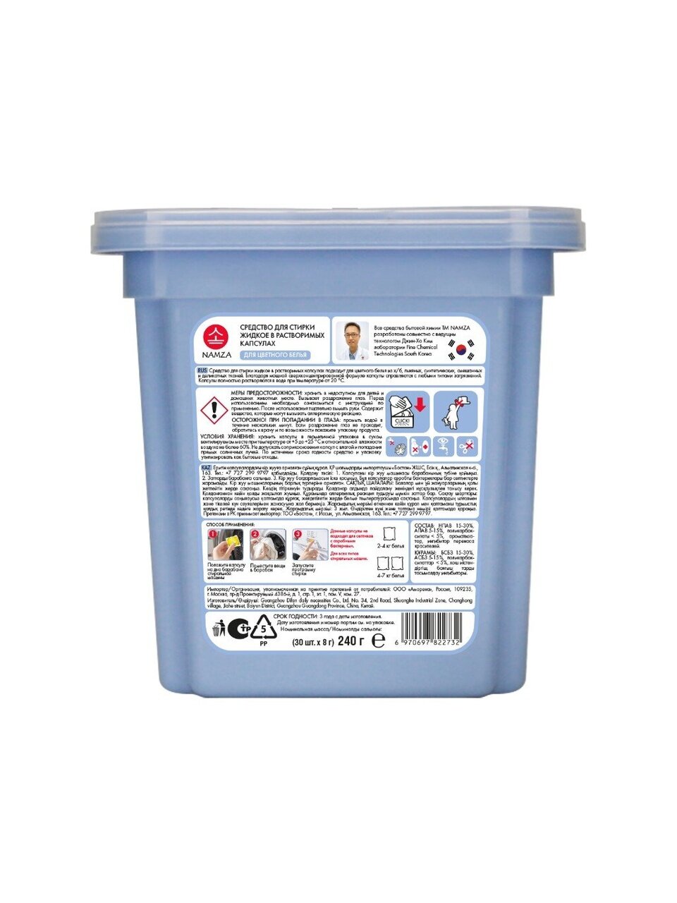 Капсулы для стирки Namza подходят для цветного белья различных типов тканей, включая хлопок, лен, синтетику, смешанные и деликатные ткани. Благодаря сверхконцентрированной формуле капсулы эффективно устраняют загрязнения любого типа. Антистатическое средство в составе препятствует возникновению статического электричества на одежде.