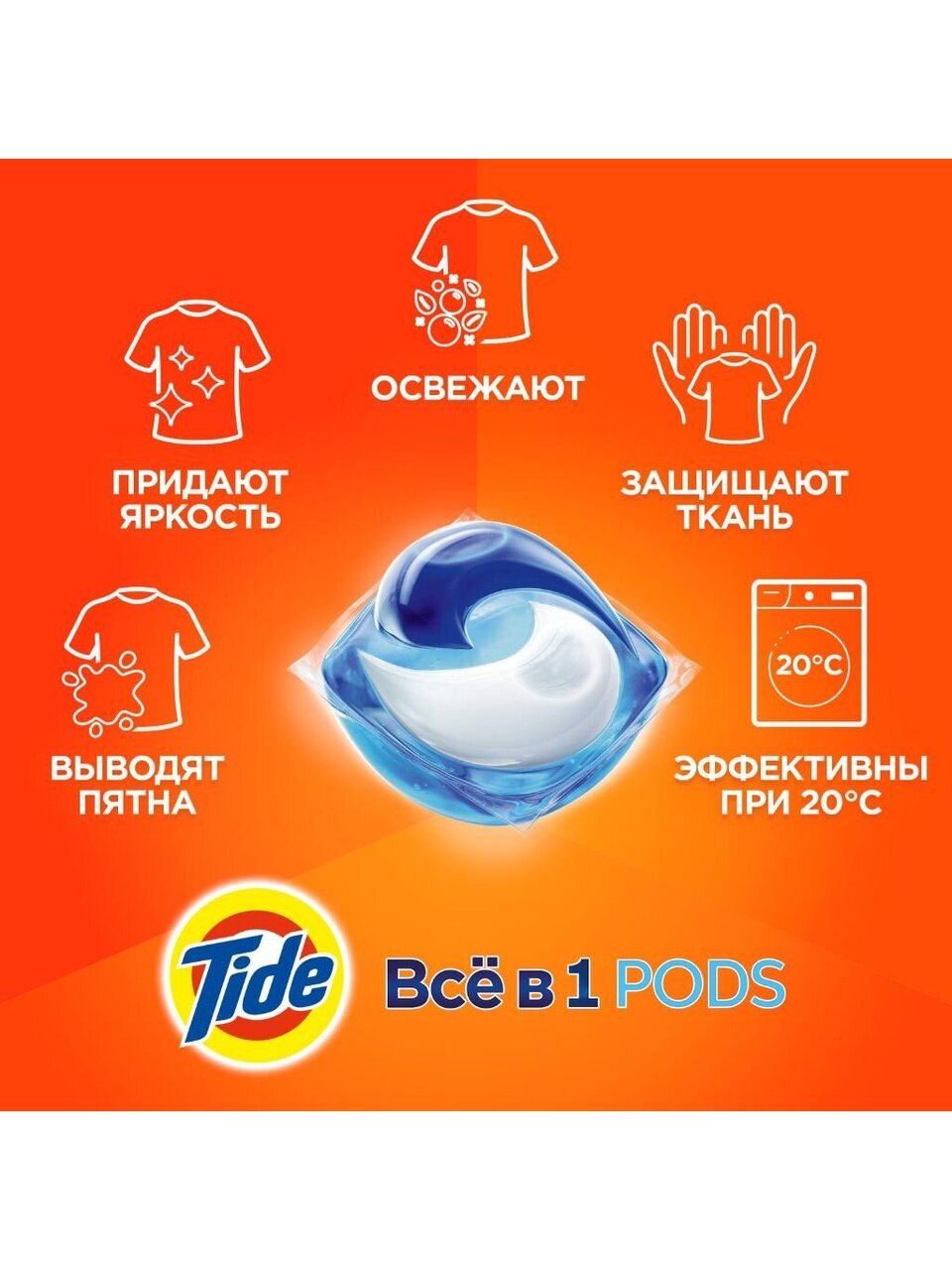 Удивительная сила отстирывания Tide - теперь в одной маленькой капсуле. Капсулы для стирки Tide Все в 1 Pods созданы, чтобы справиться с самыми сложными задачами стирки. Капсулы Tide Все в 1 PODs c многокамерным уникальным дизайном содержат концентрированное моющее средство. Благодаря пленке с высокой растворимостью капсулы активируются при контакте с водой, поэтому они очищают, удаляют пятна, придают яркость, освежают и эффективны даже при 30 градусах.