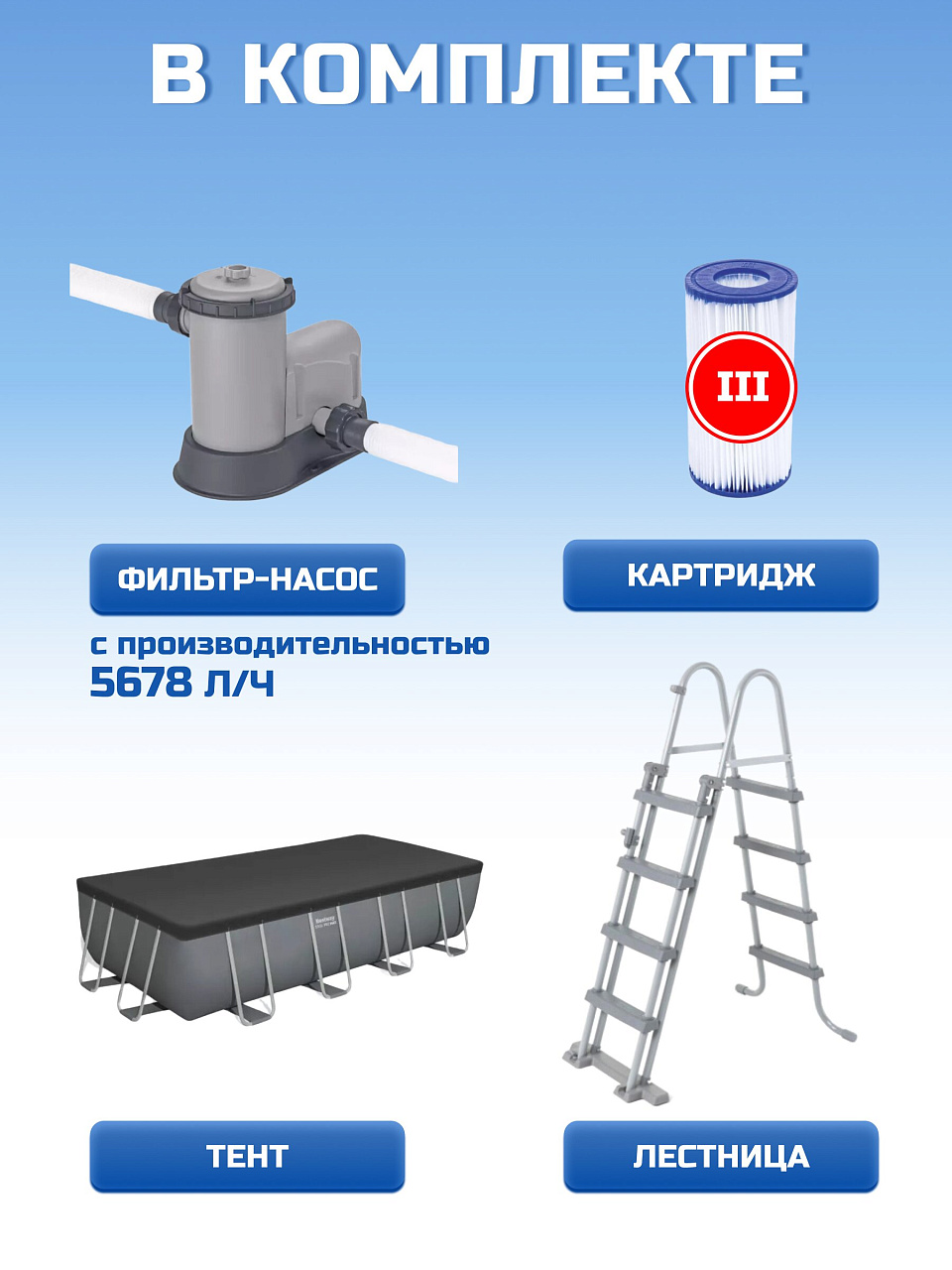 Вы можете приобрести «Бассейн каркасный Bestway, 549х274х122 см, Power Steel Rectangular, 56465, фильтр-насос, лестница, тент, 14812 л» и другие товары в нашем интернет-магазине в Белгороде по низким ценам и с бесплатным самовывозом.