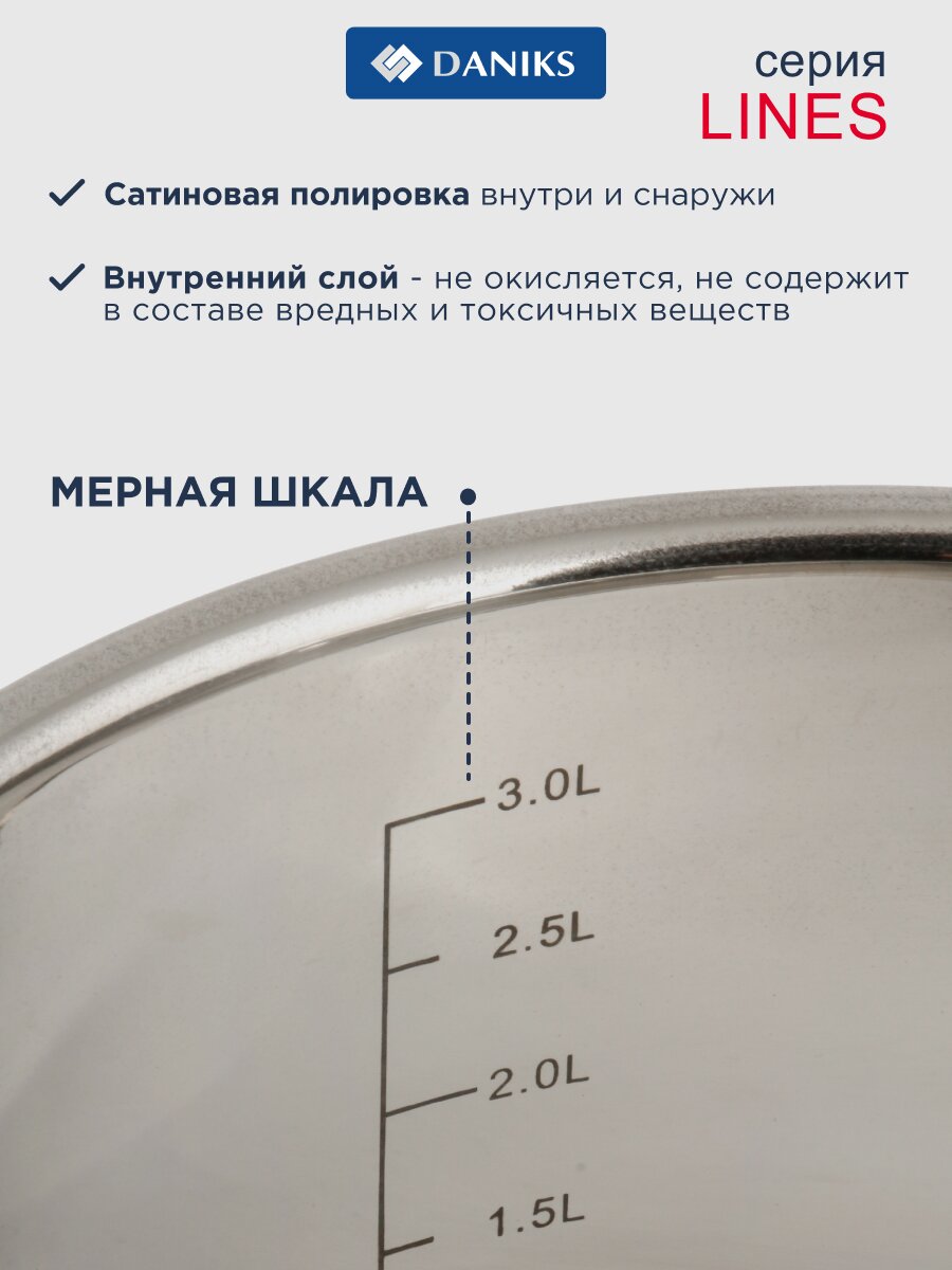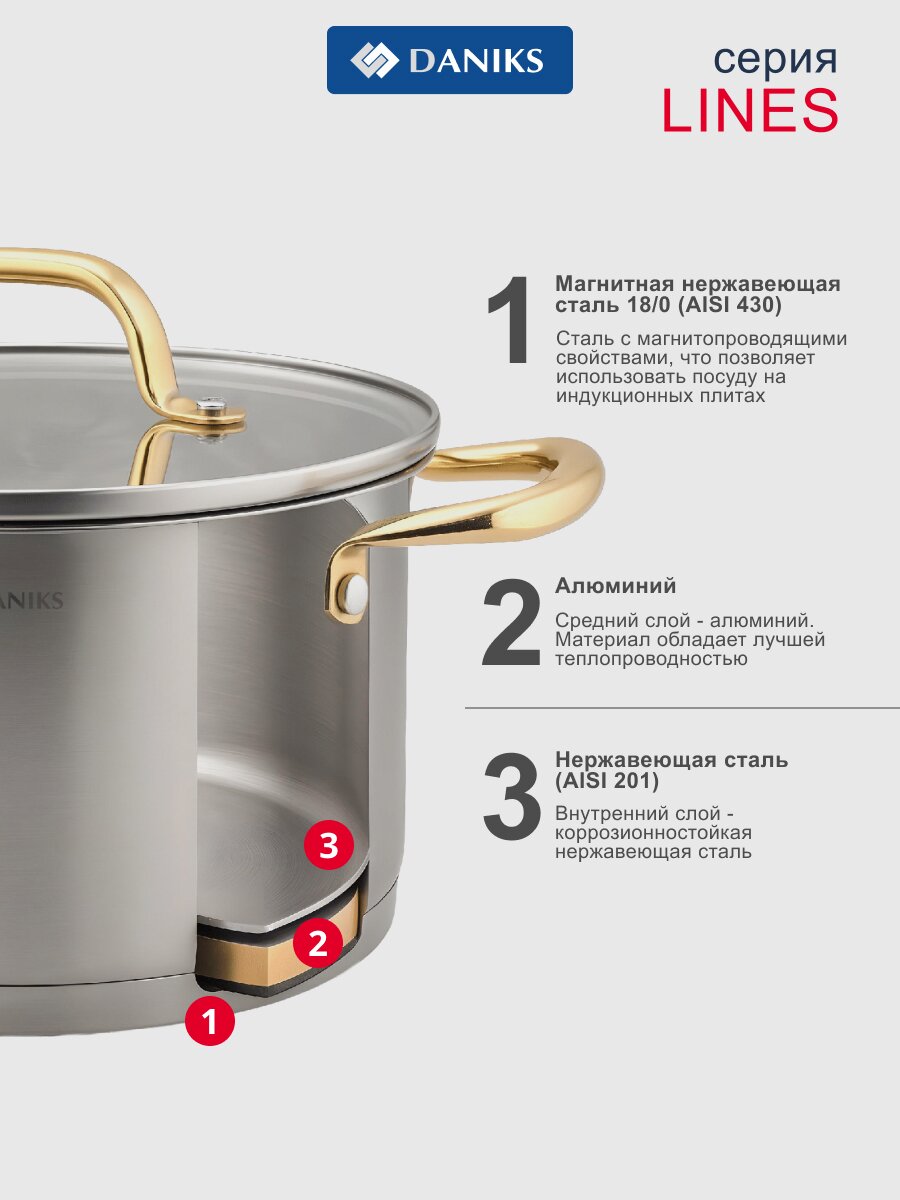 Кастрюля из нержавеющей стали Daniks Лайнс 3,9 л с капсульным дном и стеклянной крышкой: универсальное решение для индукционных и любых плит. Гарантия 12 мес.