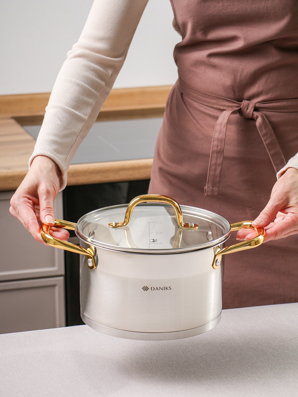 Многие спрашивают: «Подходит ли кастрюля Daniks для варки супа или варенья?» — объём 3,9 л и наличие мерной шкалы делают её идеальной для приготовления первых блюд, компота, голубцов. Стеклянная крышка с выпускным клапаном позволяет контролировать процесс без лишнего пара. По сравнению с алюминиевыми аналогами, нержавеющая сталь сохраняет вкус и полезные свойства продуктов, не вступая в реакцию с кислотами.
