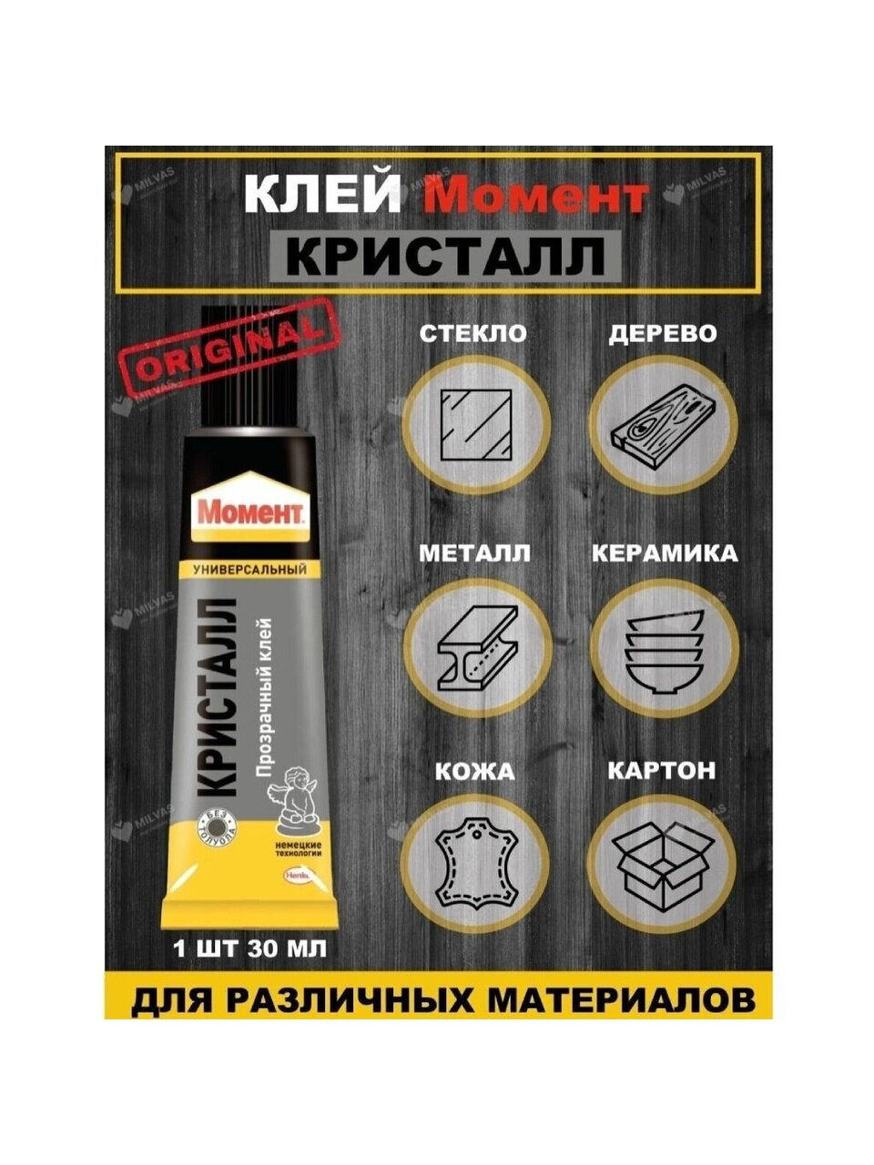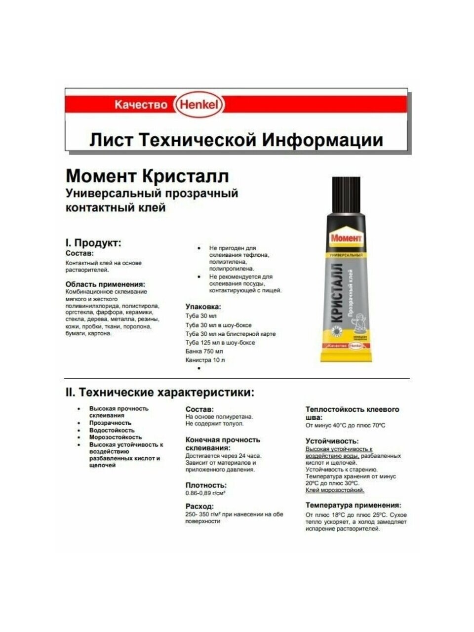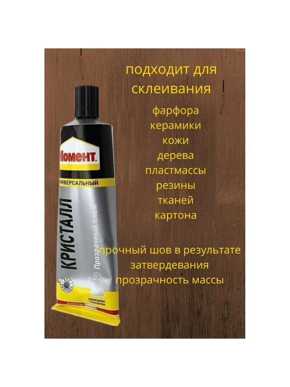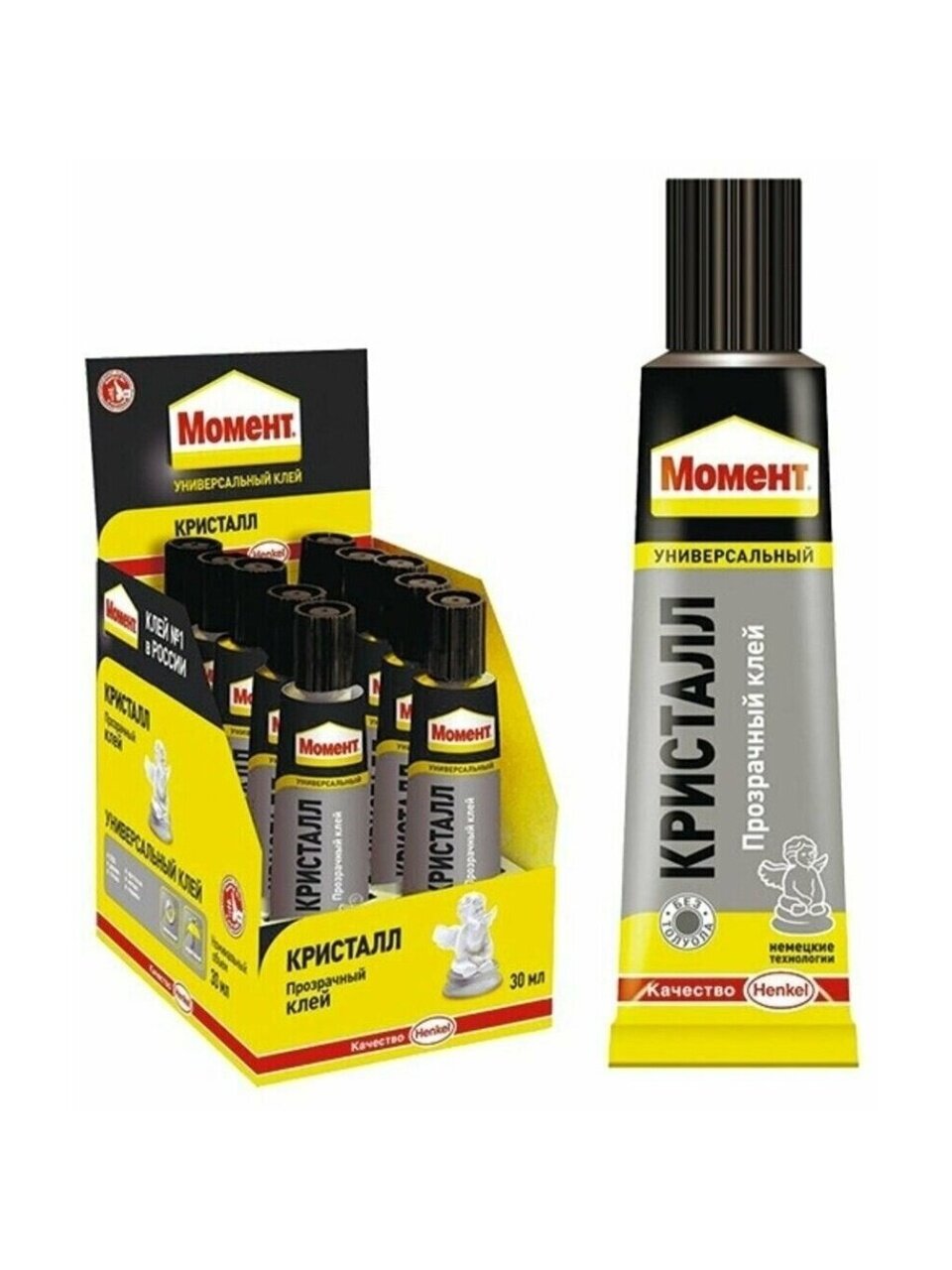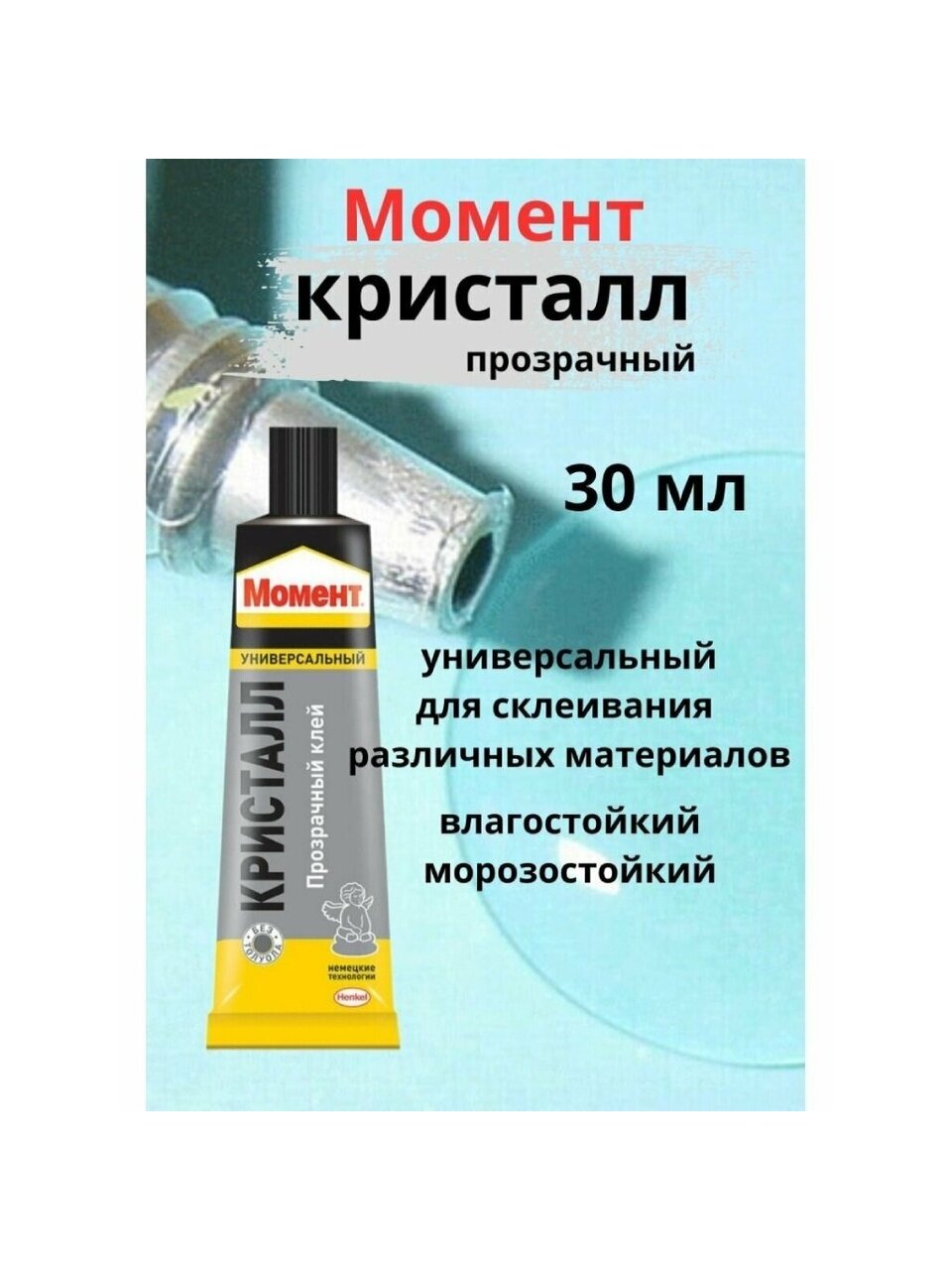 Момент Кристалл особенно хорошо подходит для склеивания мягкого и жесткого поливинилхлорида, полистирола, оргстекла и других пластиков, в различных сочетаниях склеивает дерево, металл, резину, бумагу, картон, полиуретан, пробку, поролон, фарфор, керамику, стекло, кроме посуды, контактирующей с пищей. Не подходит для стиропора, полиэтилена и полипропилена. Является прозрачным, водостойким, обеспечивает высокую прочность склеивания.
