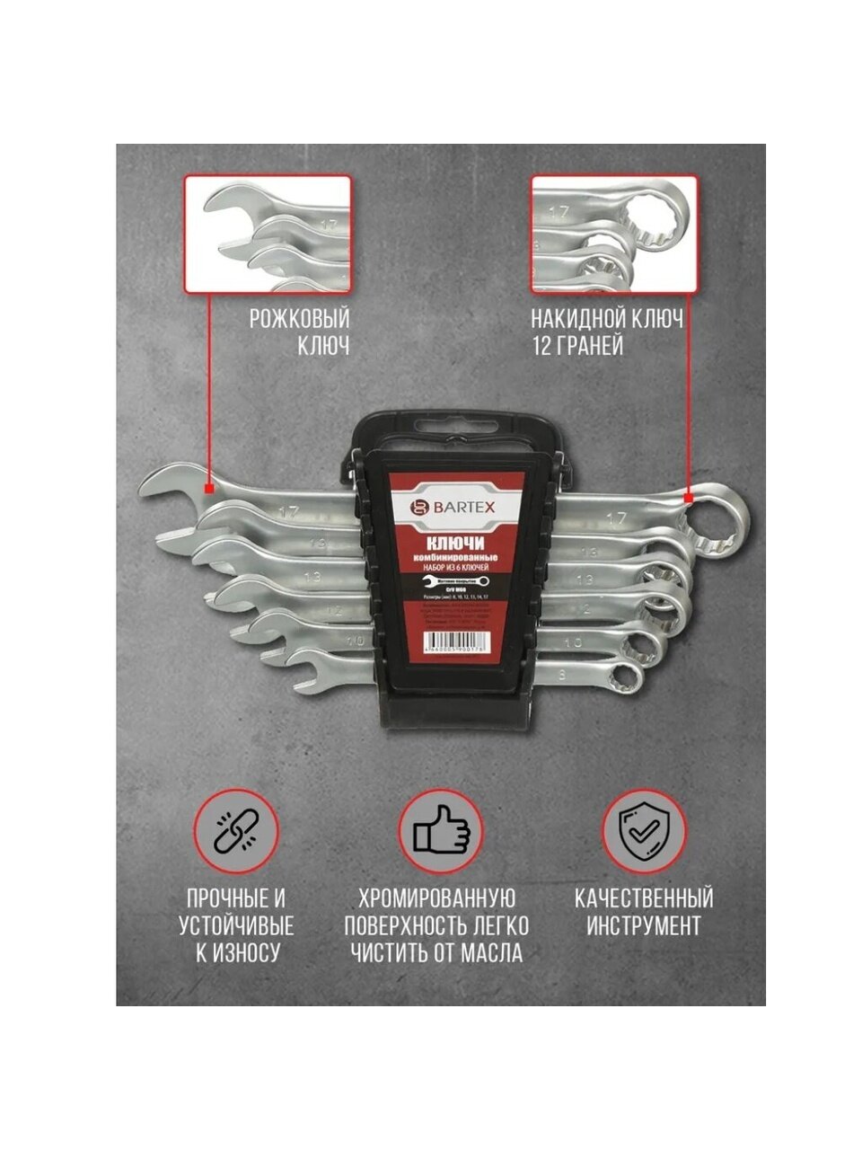 Вы можете приобрести «Ключ комбинированный, 6 предметов, Bartex, 8-17 мм, CrV, подвес» и другие товары в нашем интернет-магазине в Таганроге по низким ценам и с бесплатным самовывозом.
