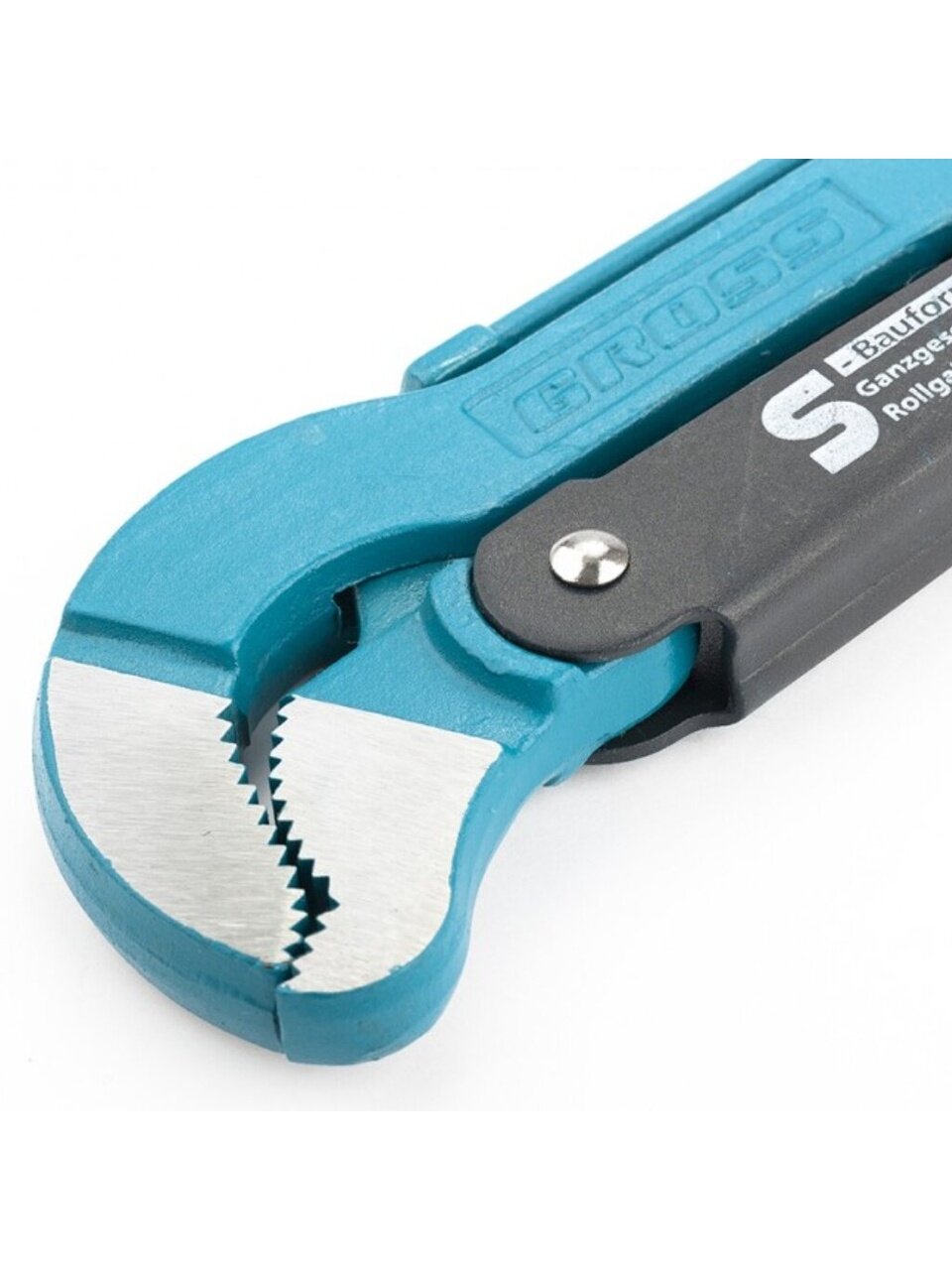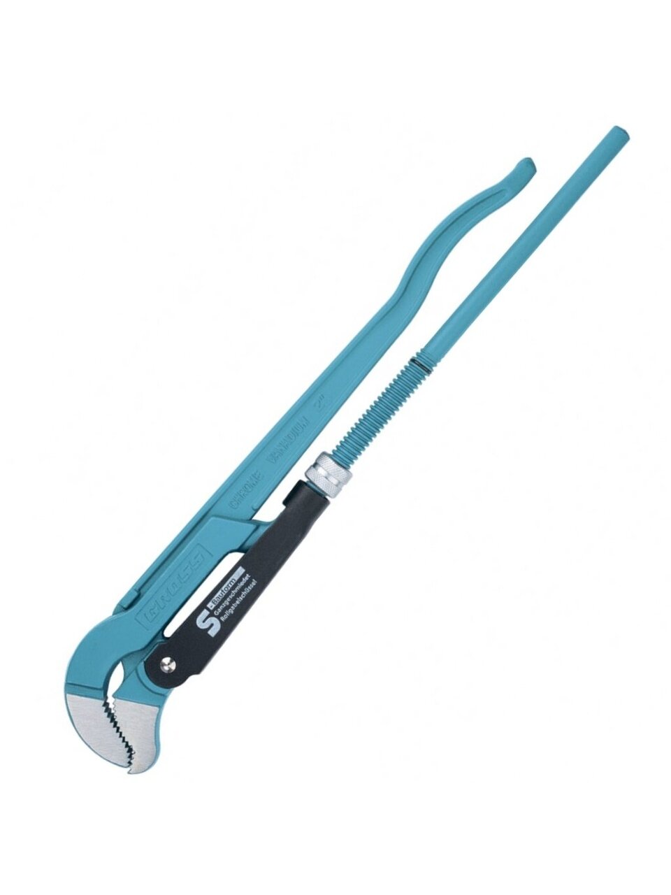 Ключ трубный рычажный типа S усиленной конструкции, применяется при повышенных нагрузках. Предназначен для захватывания и вращения труб и соединительных частей трубопроводов. Изготовлен из высококачественной хромованадиевой стали. Имеет порошковое антикоррозийное покрытие. Губки дополнительно закалены токами высокой частоты до твердости 57–60 HRС. Прогрессивная форма зуба с наклоном против направления вращения обеспечивает самоблокируемый захват деталей. Верхняя ручка имеет выштампованный Т-образный профиль. Регулировочная гайка снабжена стопорным кольцом.