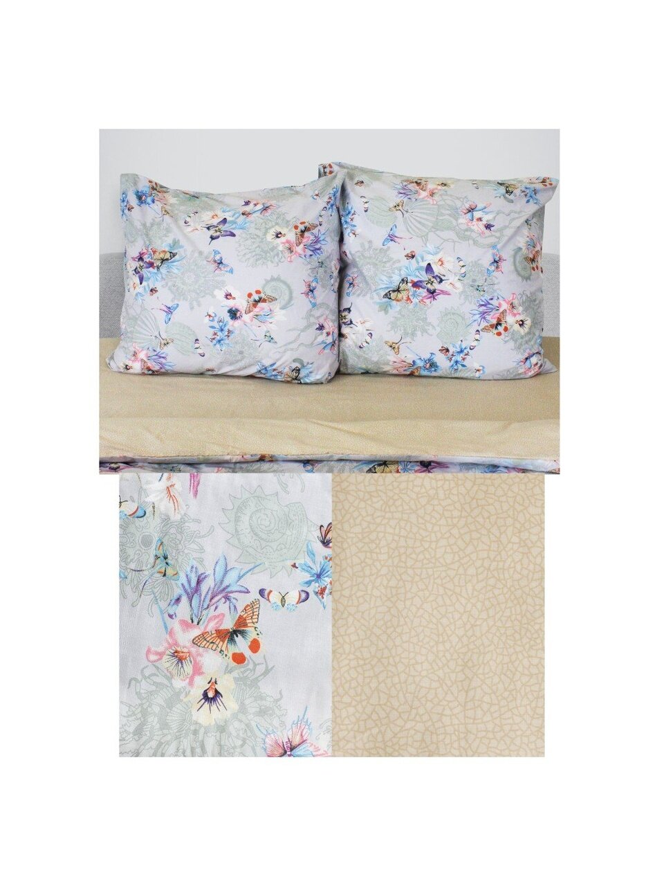 В комплекте простыня 220х240 см, два пододеяльника по 145х215 см, четыре наволочки (2 шт. 70х70 и 2 шт. 50х70 см). Простыня без резинки — подходит для стандартных и высоких матрасов.