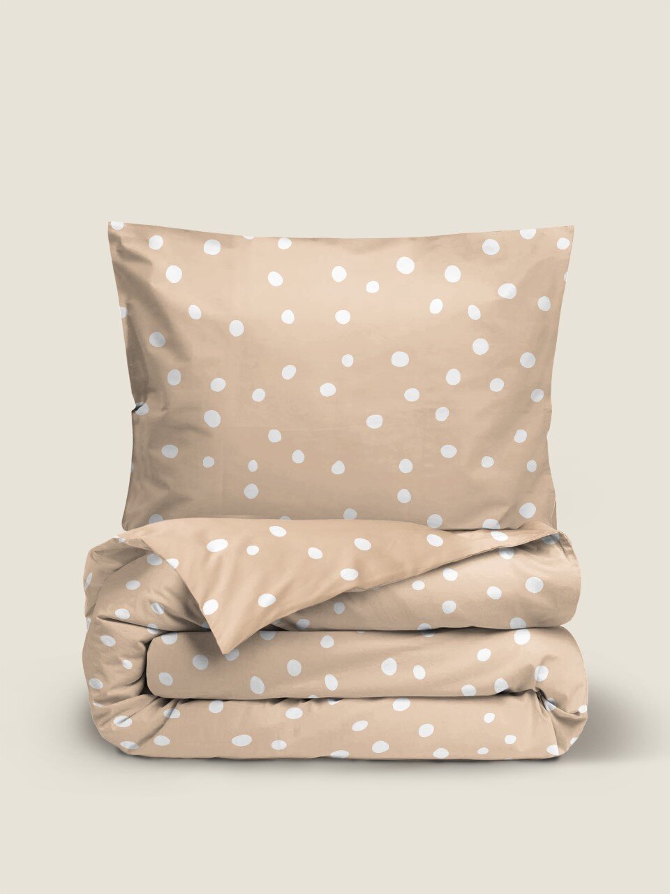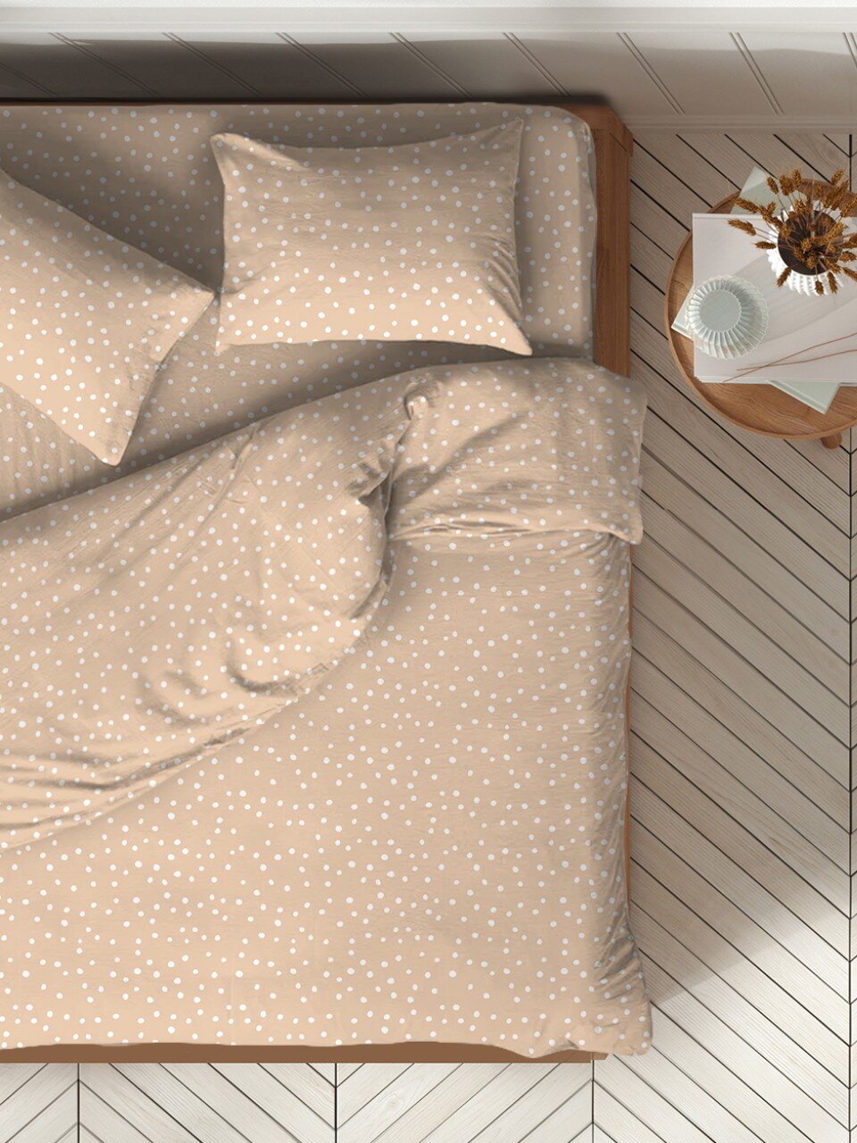 - Стильный дизайн с узором «горох» и универсальным бежевым цветом – подходит под любой интерьер спальни.
