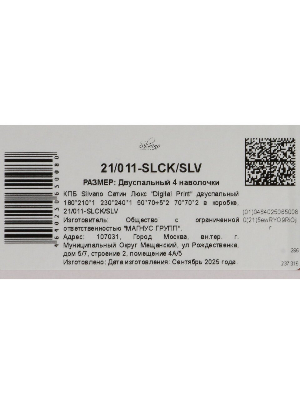 Комплект Silvano рассчитан на стандартные двуспальные кровати: простыня 230×240 см, пододеяльник 180×210 см, 4 наволочки (2×50×70, 2×70×70). Подходит для большинства популярных матрасов без резинки.