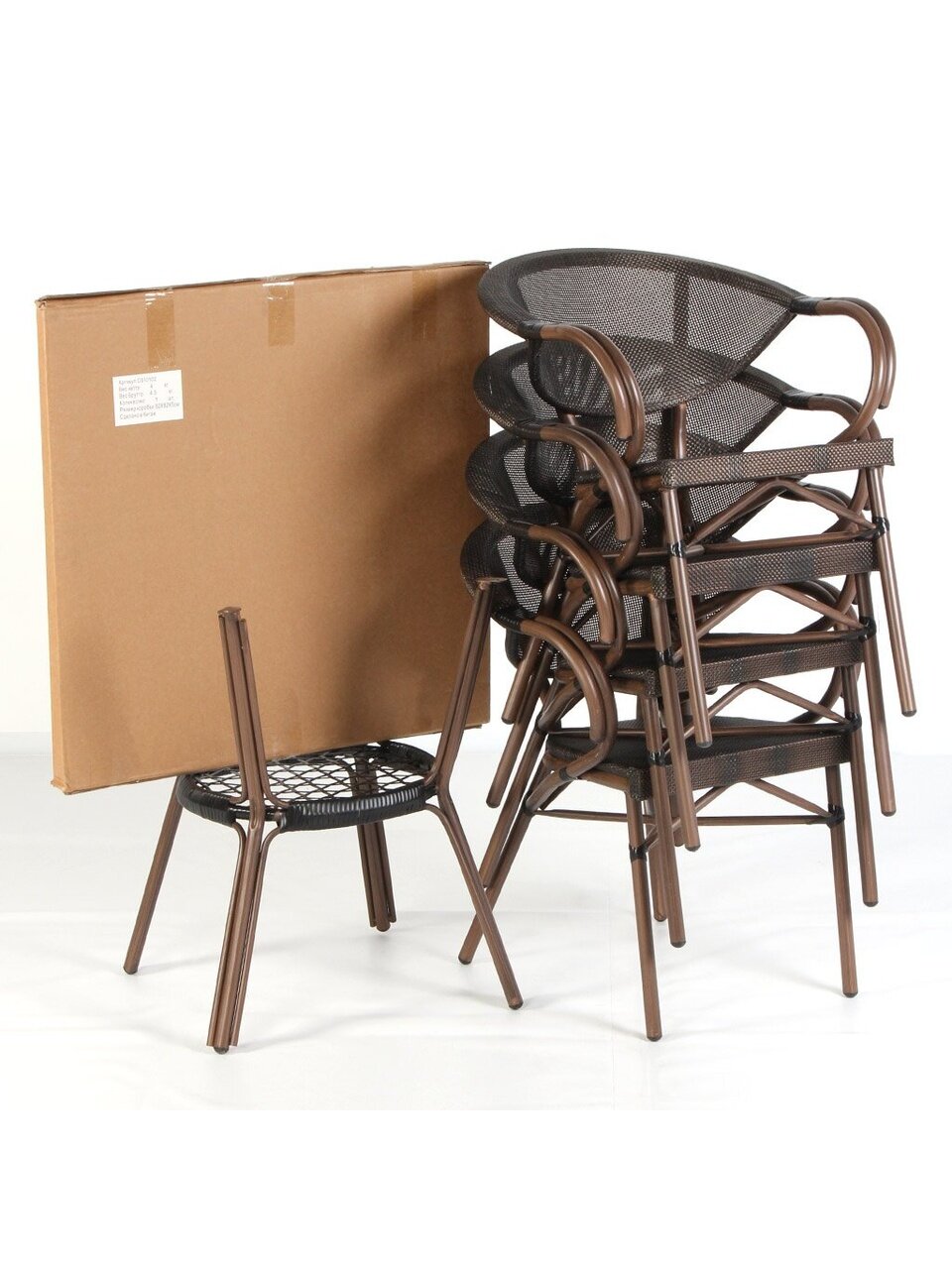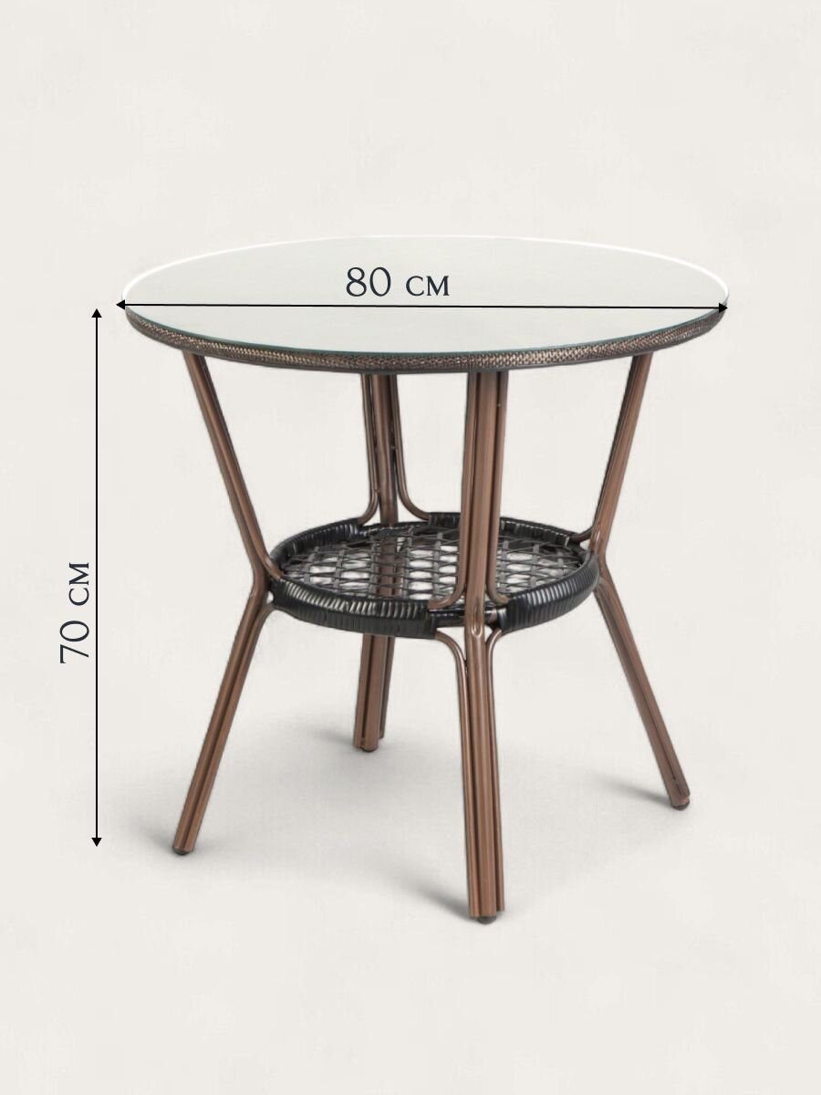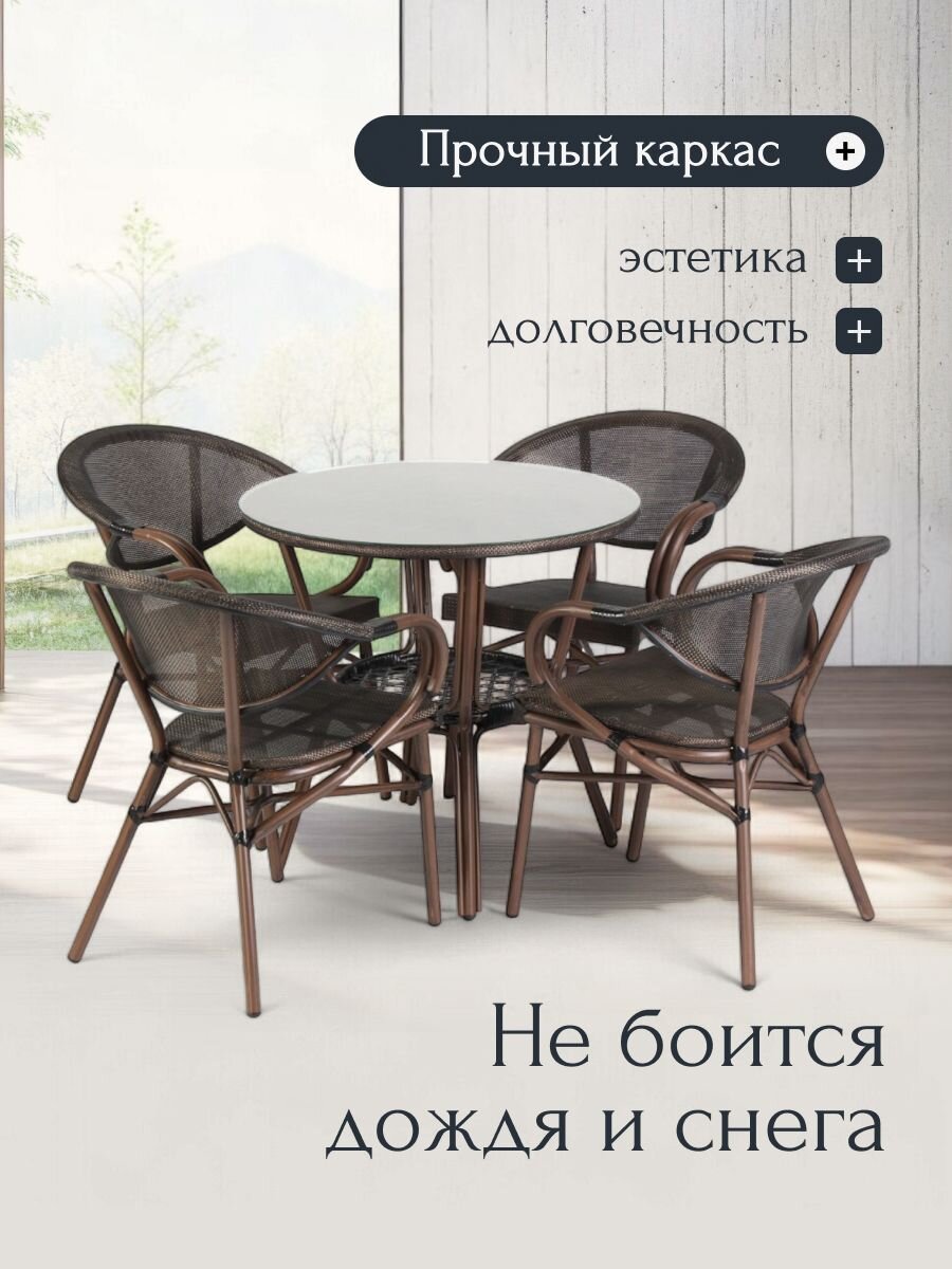 Садовая мебель Либерия – стильное и практичное решение для создания уютной обстановки на даче, в саду, на террасе или уличной зоне кафе. Комплект из пяти предметов включает круглый стол диаметром 80 см и четыре удобных стула, что идеально подходит для дружеских встреч, семейных обедов или отдыха на свежем воздухе. Благодаря лаконичному дизайну и универсальному коричневому цвету мебель гармонично впишется в любой ландшафт и легко сочетается с другими элементами экстерьера.