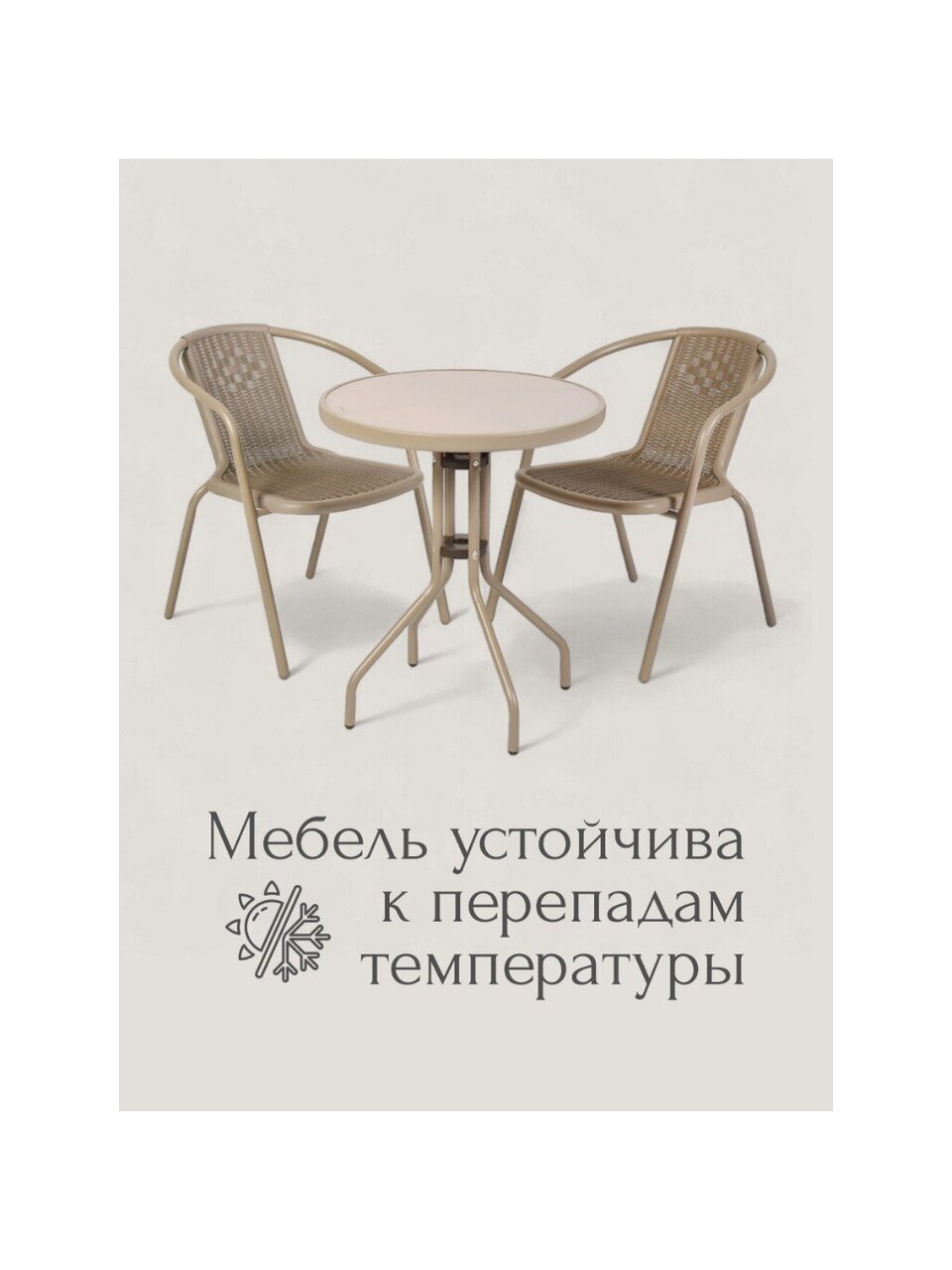 Комплект садовой мебели Ливадия NEW создан с учетом потребностей современных покупателей, ценящих качество, практичность и эстетику. Бежевый оттенок придаёт интерьеру лёгкость, визуально расширяет пространство и помогает создать атмосферу спокойствия и уединения. Стол и кресла обладают оптимальными размерами, что позволяет удобно расположиться для семейных посиделок, чаепития или отдыха на природе. Мебель проста в уходе, устойчива к погодным условиям и сохраняет привлекательный вид в течение долгого времени.
