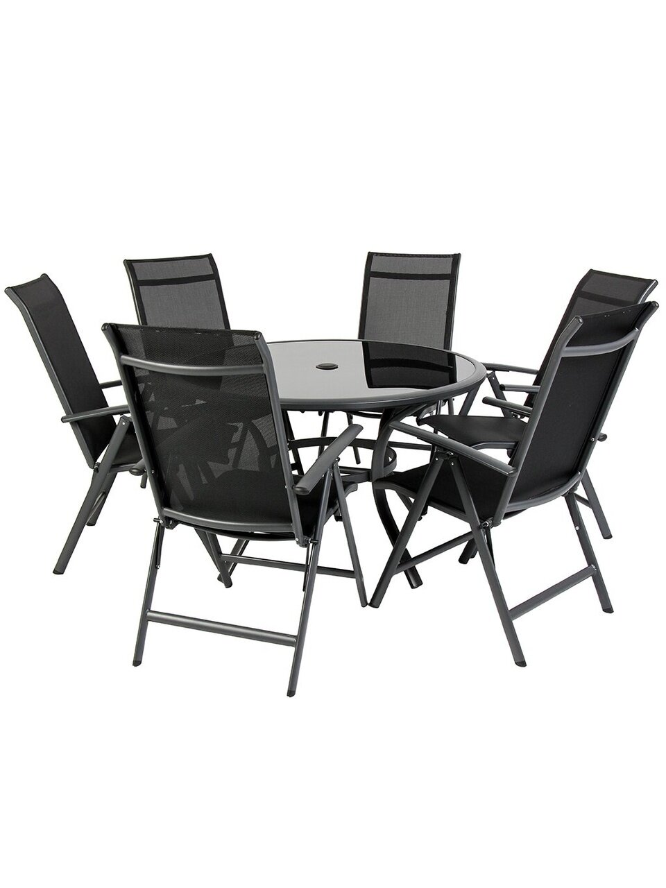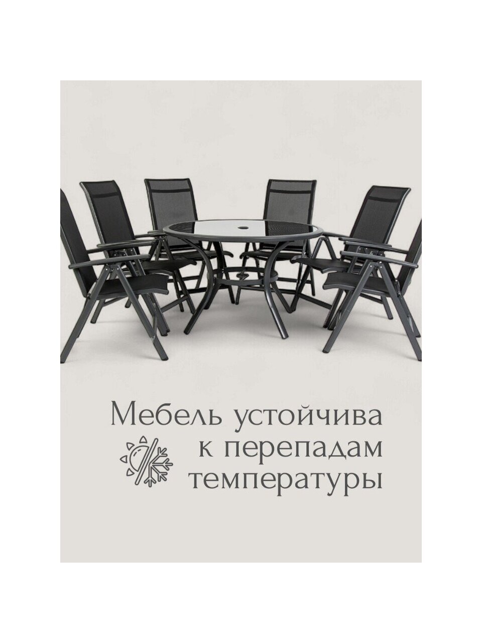 Стильная и практичная садовая мебель Рейне — оптимальное решение для обустройства комфортной зоны отдыха на даче, в саду, дома или кафе. Современный комплект включает круглый стол размером 120х72 см и шесть удобных стульев с подлокотниками (62х69х110 см), что идеально подходит для семейных встреч, дружеских посиделок и уютных обедов на свежем воздухе. Черный цвет комплекта гармонично впишется в любой ландшафт, добавит элегантности и подчеркнет индивидуальный стиль пространства.