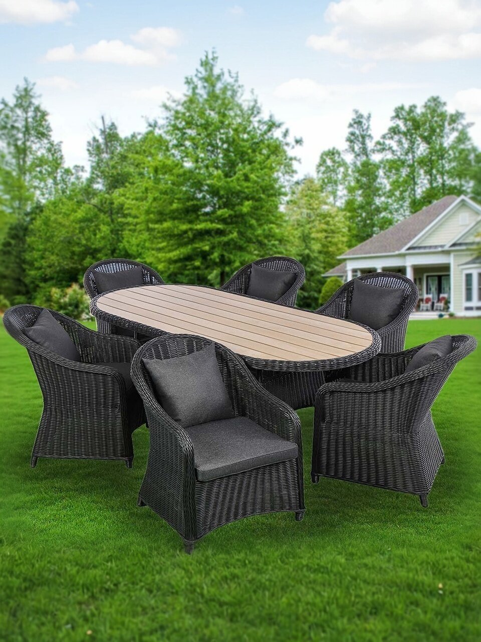 Роскошный комплект плетеной мебели станет отличным дополнением для загородного дома или дачи. Комплект состоит из шести кресел с подушками и обеденного стола. Выполнен из искусственного ротанга, устойчивого к физическому и климатическому воздействию. Отлично подходит для летней веранды на даче.