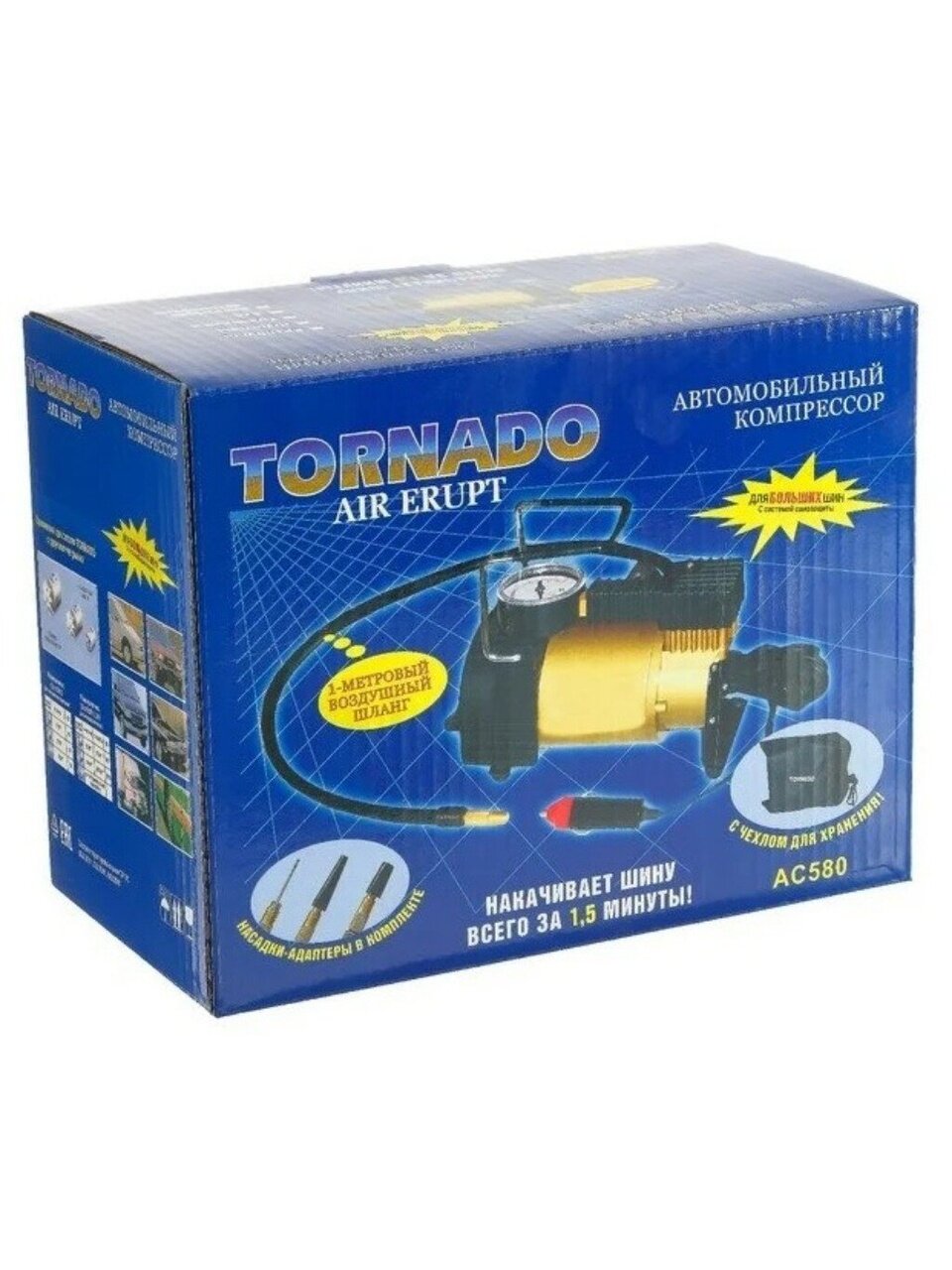 Каждый автовладелец хоть раз сталкивался с низким давлением в шинах. В такой ситуации лучшим помощником становится автомобильный компрессор. Благодаря наличию такого устройства в багажнике автомобиля Вы с легкостью накачаете колеса до необходимого уровня! Компрессор Торнадо АС-580 подходит для подкачки любого авто. Так же, вы сможете накачать им резиновую лодку, мяч, и др.