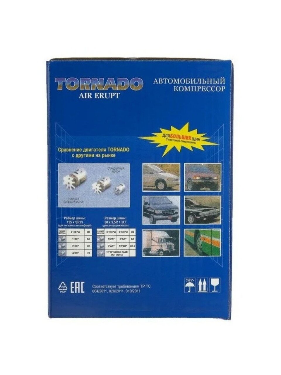 Вы можете приобрести «Компрессор автомобильный Tornado, АC-580, 30 л/мин, 12 В, 7 атм, 110 Вт, к прикуривателю, 150 PSI, КА-00058565» и другие товары в нашем интернет-магазине в Ярославле по низким ценам и с бесплатным самовывозом.