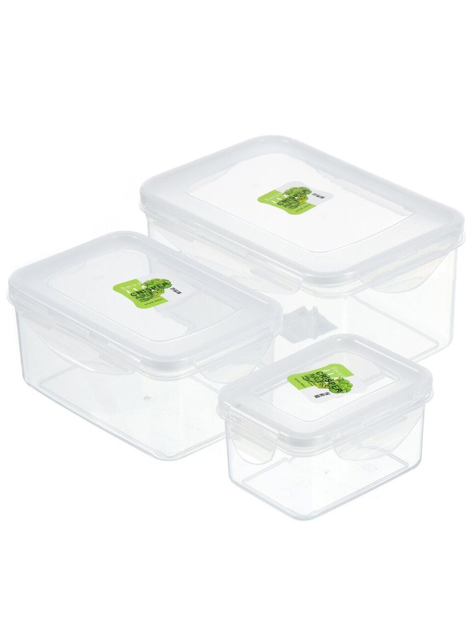 В наборе три прямоугольных контейнера с защёлками и клапаном, подходят для заморозки, не впитывают запахи, прозрачные, можно мыть в посудомоечной машине.