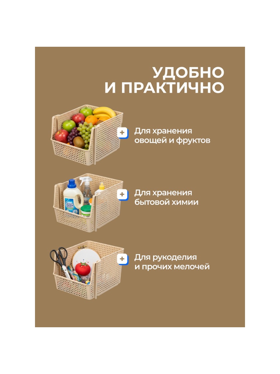 - Установив несколько корзин друг на друга можно создать удобную систему хранения, своеобразную этажерку или стеллаж с ящиками. При этом пустые ящики удобно хранить - они вставляются друг в друга, обеспечивая компактное хранение.