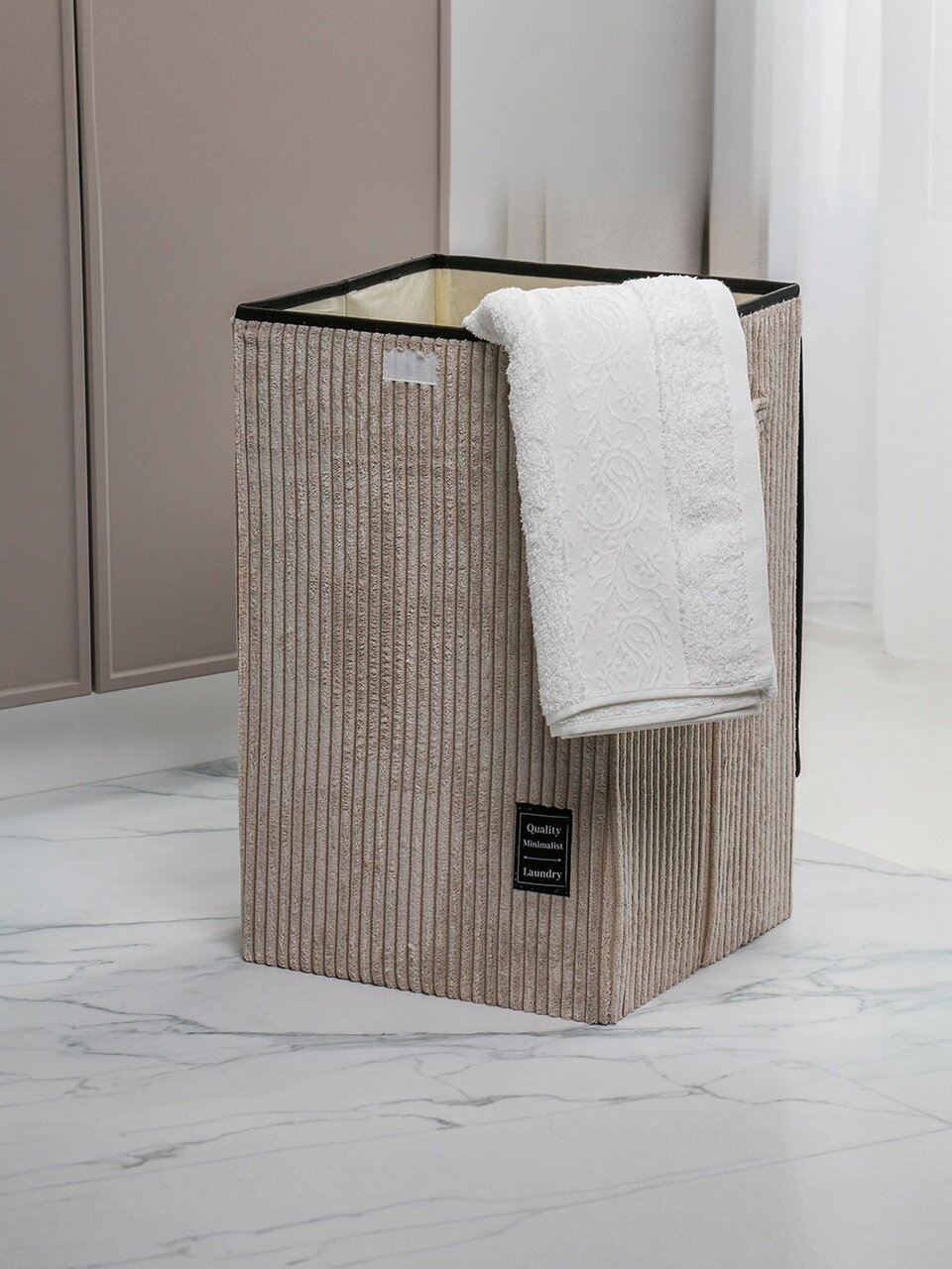 Корзина имеет размеры 33×33×53 см (ширина, глубина, высота). Вместительная, но не громоздкая, легко помещается в стандартный шкаф или на полку.