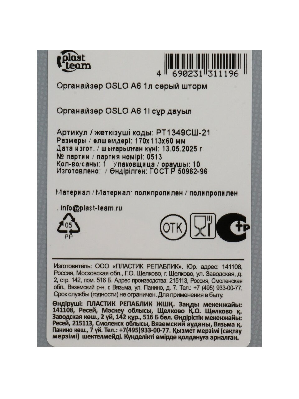 Корзина Plast team Oslo 1 л — это современное решение для организации пространства. Благодаря компактным размерам (17х11,3х0,6 см) и универсальному цвету «Серый шторм» она гармонично впишется в интерьер кухни, ванной, гардеробной или детской. Прочный пластик устойчив к влаге и деформации, что делает корзину подходящей для хранения пищевых продуктов, бытовой химии и аксессуаров.