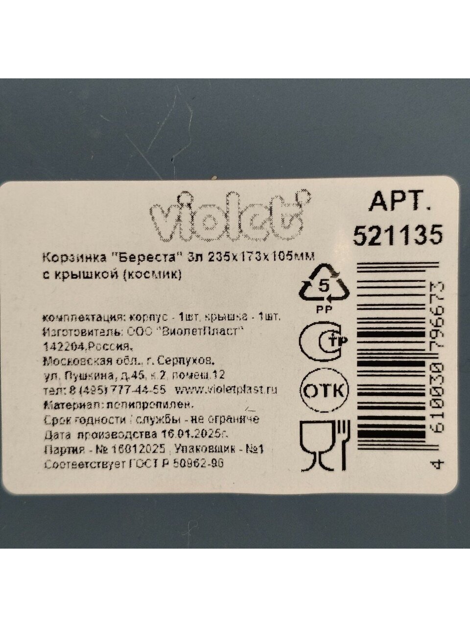 Вы можете приобрести «Корзина для хранения, 3 л, 23.5х17.3х10.5 см, прямоугольная, пластик, космик, с крышкой, Violet, Береста, 521135» и другие товары в нашем интернет-магазине в Смоленске по низким ценам и с бесплатным самовывозом.