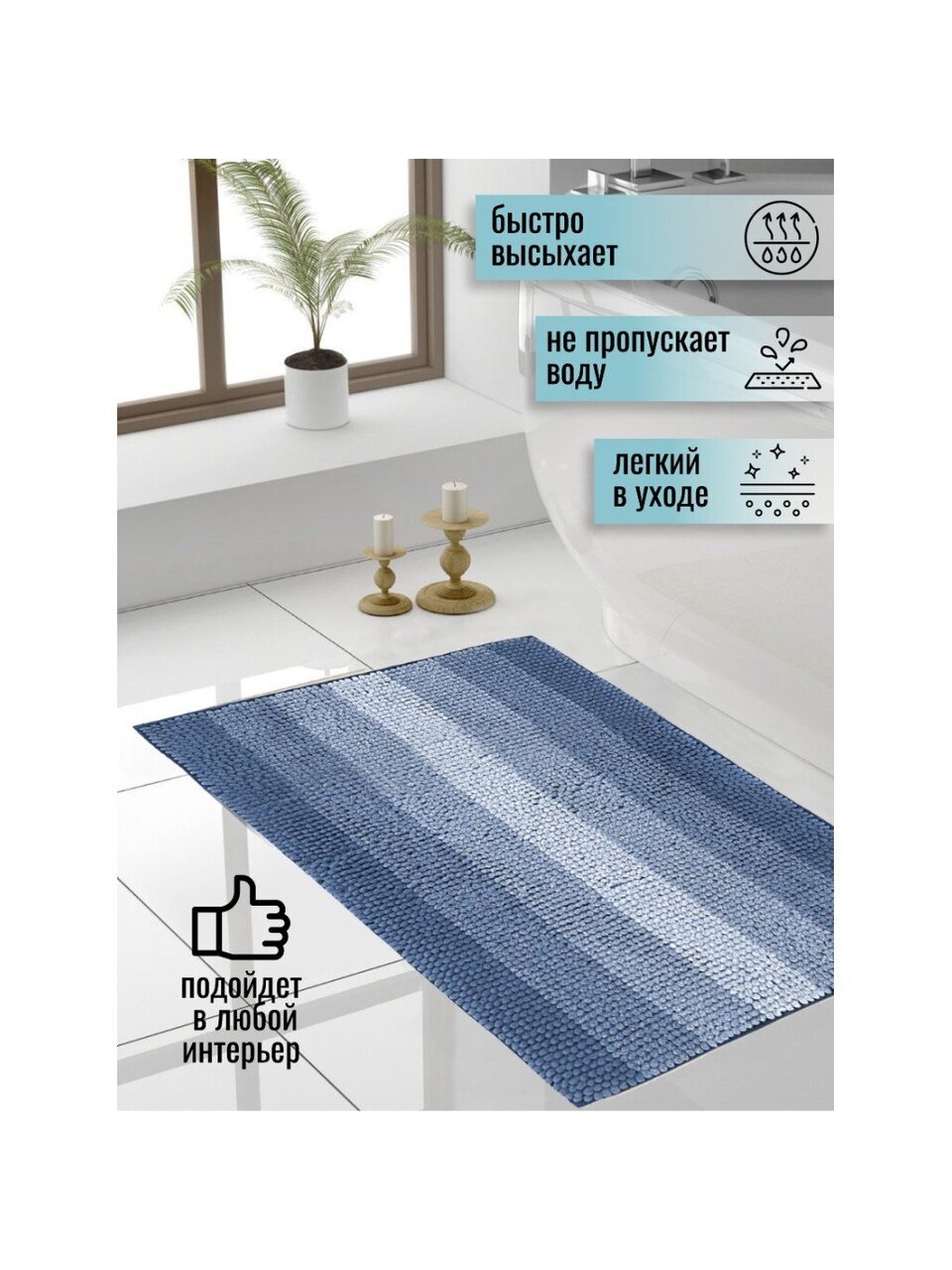 Постелите коврик на пол и заходить в ванную босиком будет приятно даже в холодное время года. Он подарит ощущение тепла и комфорта, а благодаря универсальному дизайну отлично впишется в ваш интерьер.