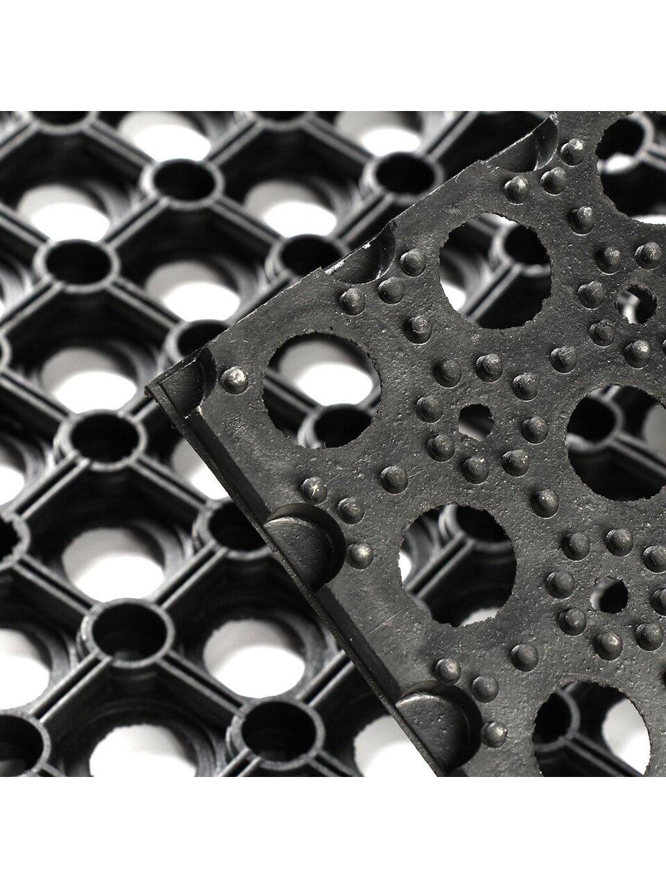 Коврик имеет сквозные отверстия, благодаря которым вода и грязь легко проходят сквозь него, обеспечивая чистоту и сухость поверхности. Прямоугольная форма и классический черный цвет позволят ему гармонично вписаться в любой экстерьер, подчёркивая стиль и практичность вашего дома.
