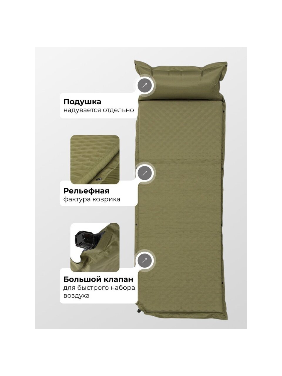 Самонадувающийся коврик 180х65х5 см – практичное решение для комфортного отдыха на природе, даче или в путешествии. Легко взять с собой на пикник, кемпинг или рыбалку. Благодаря компактному размеру и легкости, коврик не займет много места в багажнике автомобиля или рюкзаке, а его стильный цвет хаки гармонично впишется в окружающую природу. Коврик сочетает в себе функции каремата, матраса и туристического коврика, что делает его универсальным аксессуаром для активного образа жизни. Современная самонадувающаяся конструкция позволяет быстро подготовить место для сна или отдыха без лишних усилий и насоса – достаточно просто развернуть коврик, и он самостоятельно наполнится воздухом до оптимальной толщины 5 см, обеспечивая надежную защиту от холода и неровностей поверхности.