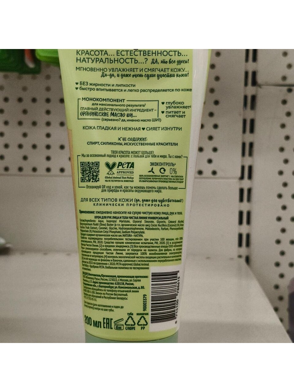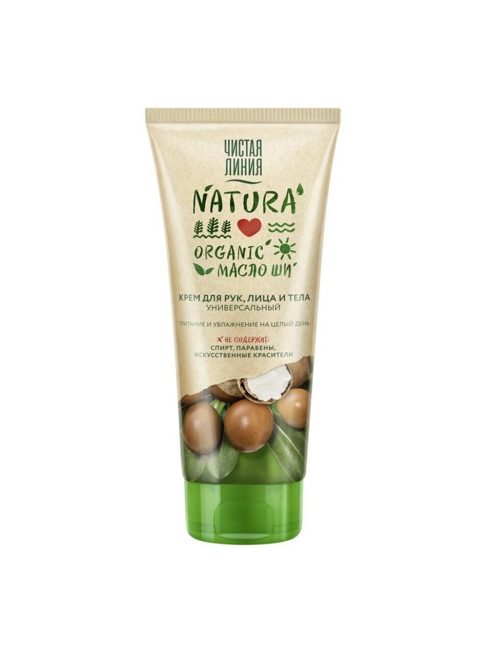 Универсальный крем Чистая Линия Natura для рук, лица и тела с organic маслом ши хорошо питает, увлажняет и смягчает. Не содержит: парабены, красители, спирт. Главный действующий ингредиент - organic масло ши... Серьезно?да, именно масло ШИ! Оно глубоко* увлажняет и питает, восстанавливает, препятствуя испарению влаги, и возвращает коже упругость. Твоя кожа скажет тебе спасибо! Для всех типов кожи. Да! Даже для чувствительной. Клинически протестировано.