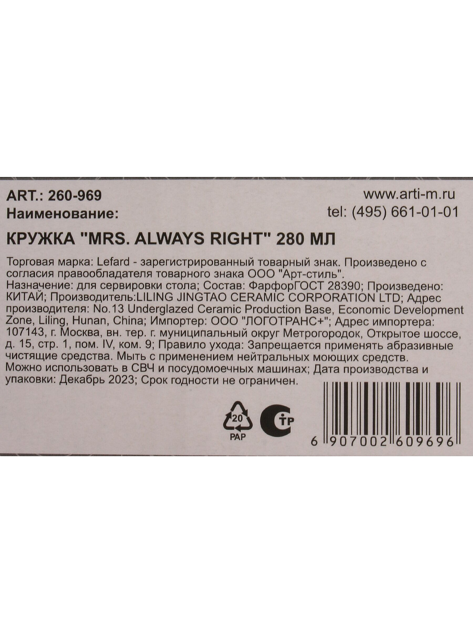 Вы можете приобрести «Кружка фарфор, 280 мл, Mrs. Always Right, Lefard, 260-969» и другие товары в нашем интернет-магазине в Тамбове по низким ценам и с бесплатным самовывозом.