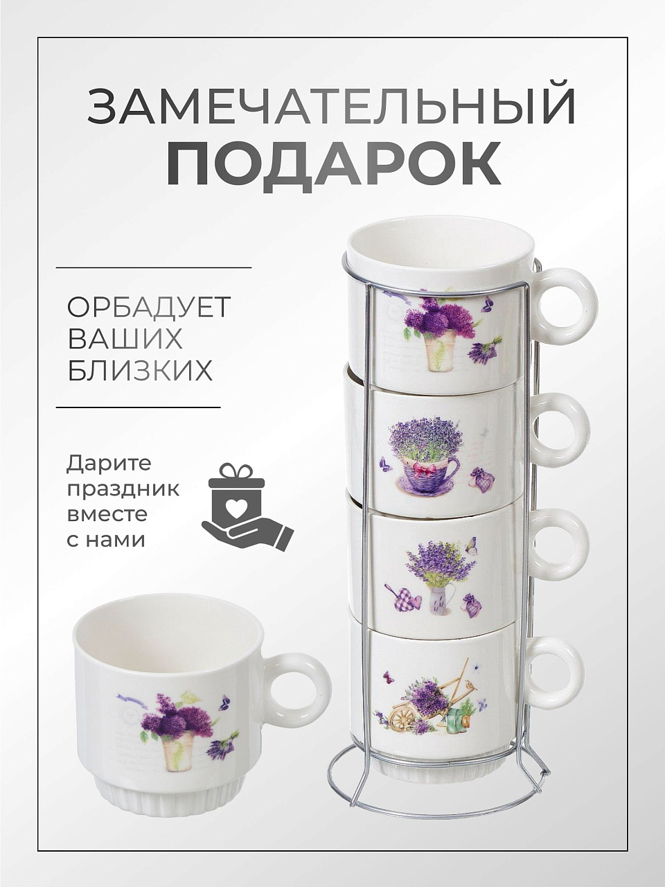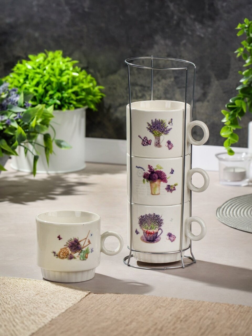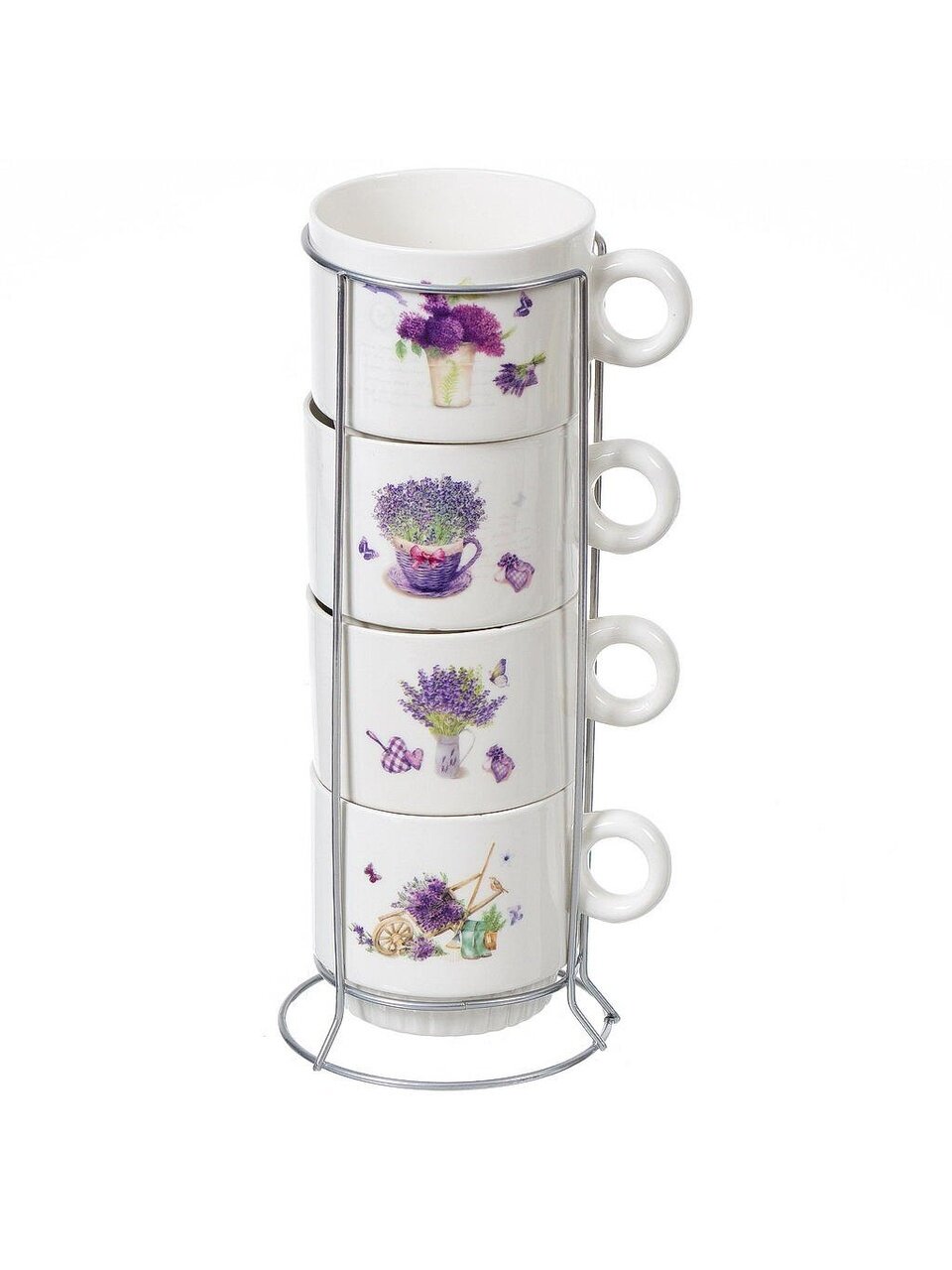 Набор керамических кружек «Лаванда» 250 мл (4 шт) с металлической подставкой — стиль для кухни и дачи, идеальный подарок и компактное хранение.