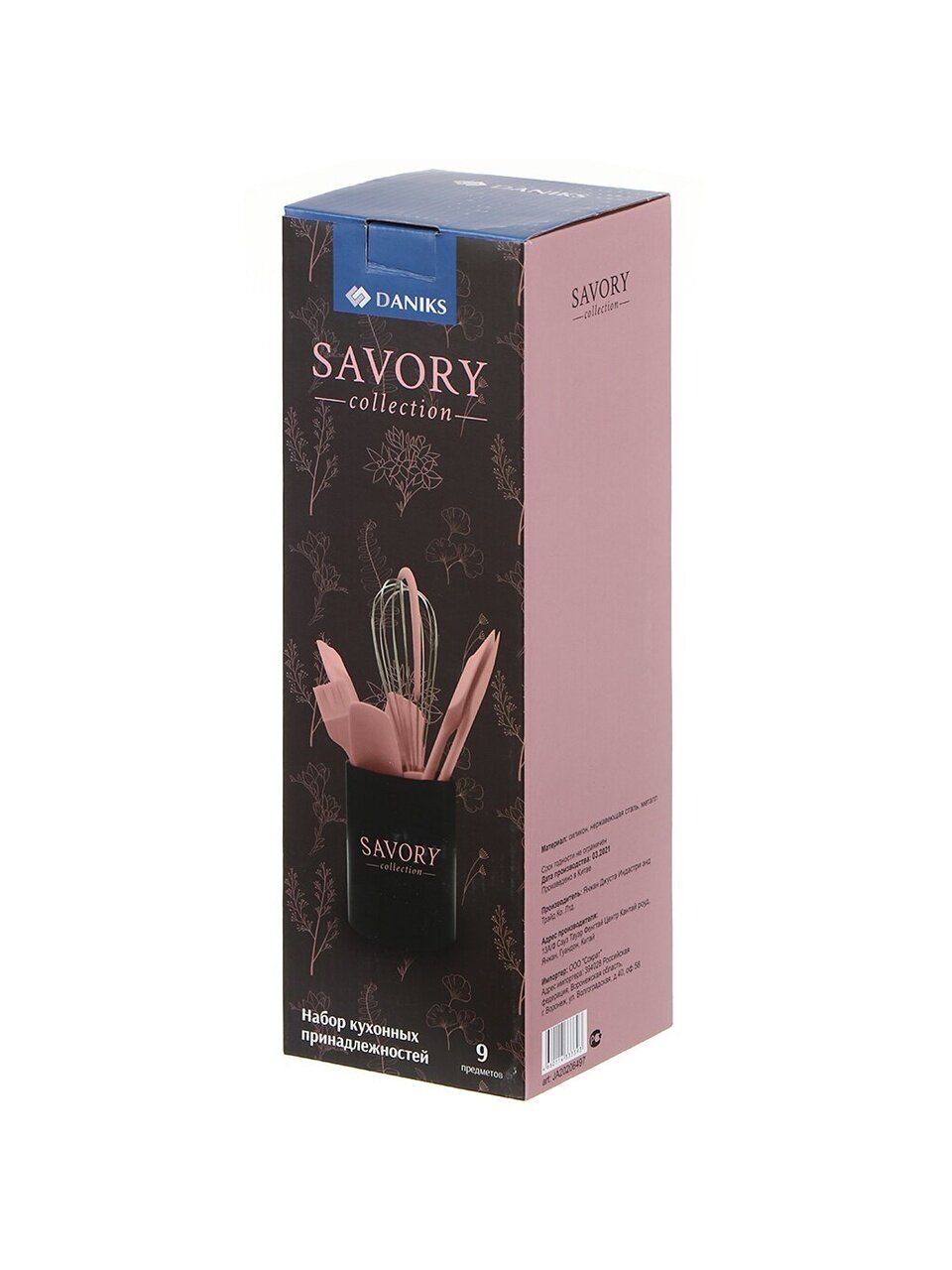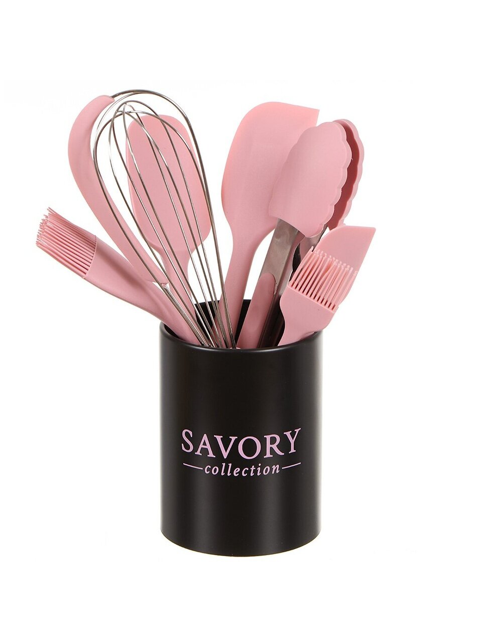 Набор кухонных инструментов на подставке выполнен из качественного термостойкого силикона, что дает им долговечность и практичность при любом виде готовки. Красиво выполненные корпуса из нежного розового цвета радуют глаз. Набор очень приятный тактильно и комфортный в использовании. Обладает устойчивостью к неприятным запахам и пятнам. Легко моется вручную или с помощью посудомойки.