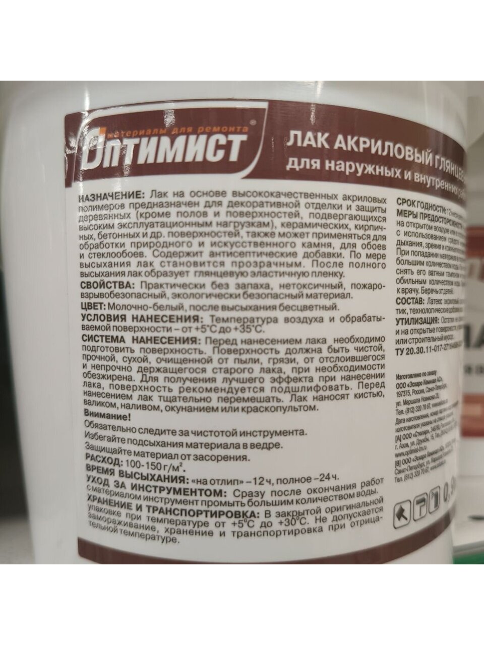 Акриловый лак Оптимист подходит как для внутренних, так и для наружных работ. Он образует эластичное и долговечное покрытие, стойкое ко влаге и УФ-излучению.