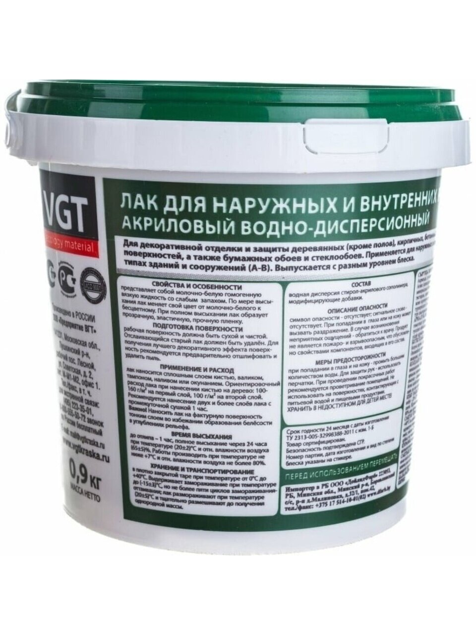 Вы можете приобрести «Лак VGT, матовый, акриловый, бесцветный, для внутренних и наружных работ, 0.9 кг» и другие товары в нашем интернет-магазине в Шахтах по низким ценам и с бесплатным самовывозом.