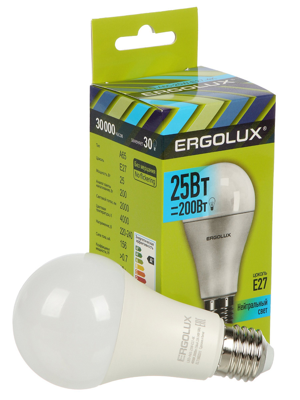 Лампа светодиодная E27, 25 Вт, 200 Вт, груша, 4000 К, нейтральный белый свет, Ergolux, 14236