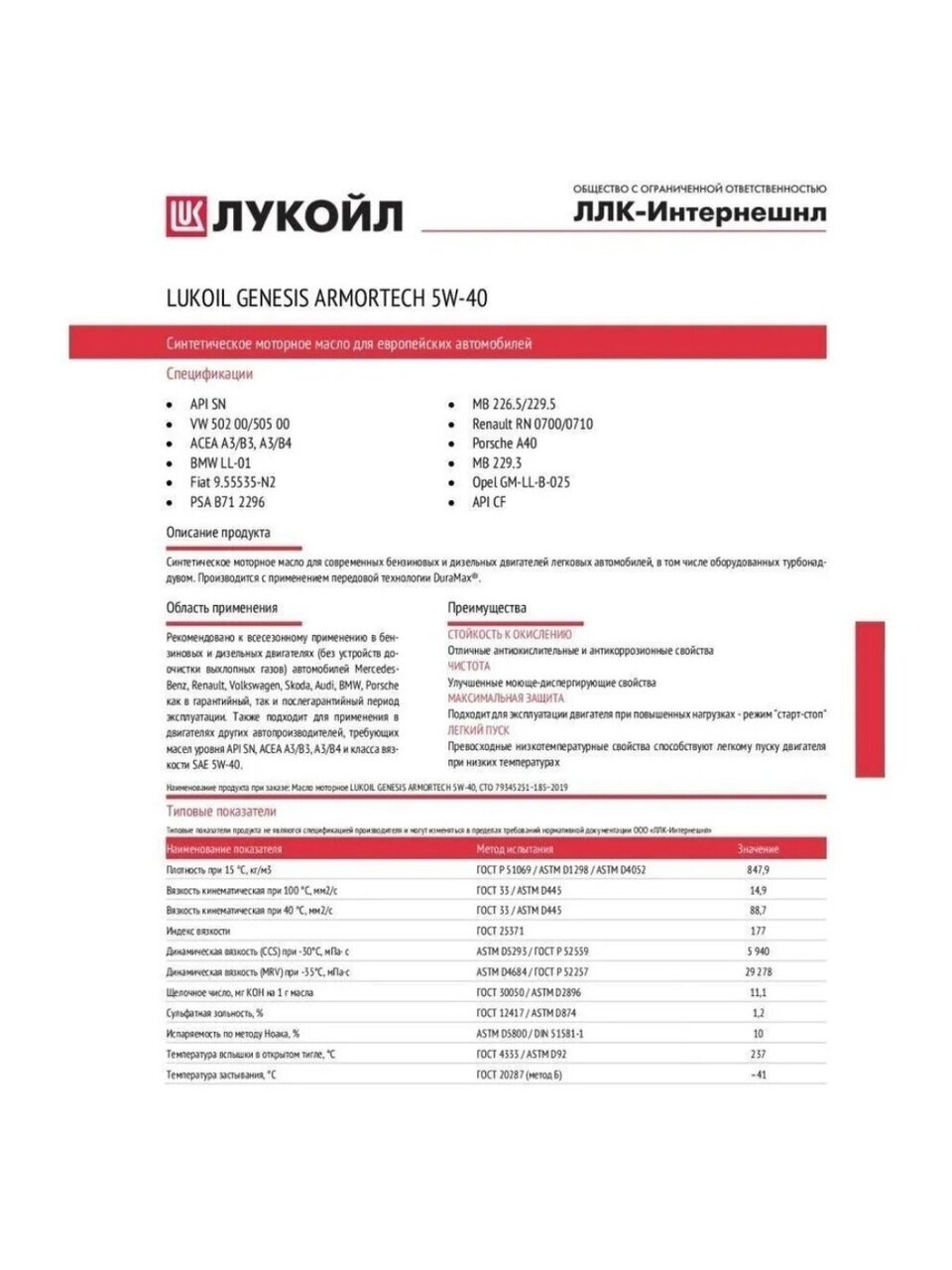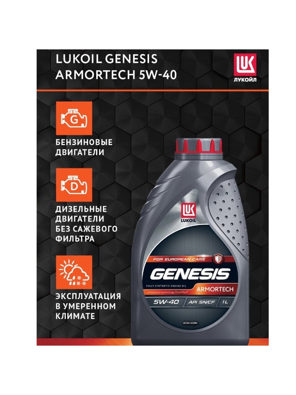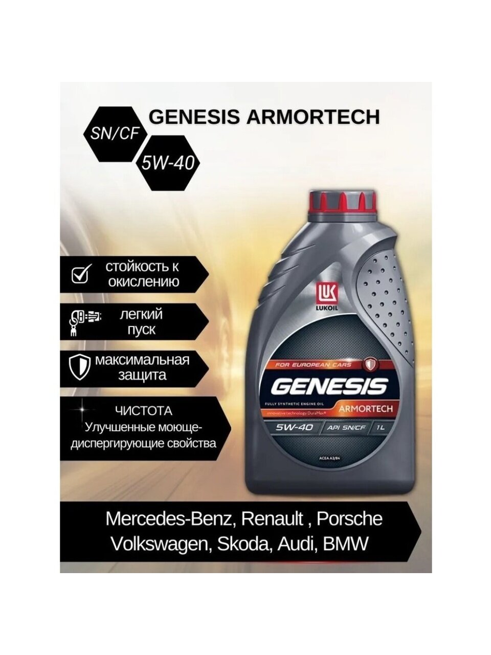 ЛУКОЙЛ GENESIS ARMORTECH 5W-40 - всесезонное полностью синтетическое моторное масло последнего поколения для применения во всех современных высокофорсированных двигателях легковых, легких грузовых, спортивных автомобилей и микроавтобусов, в том числе оборудованных турбонаддувом.
