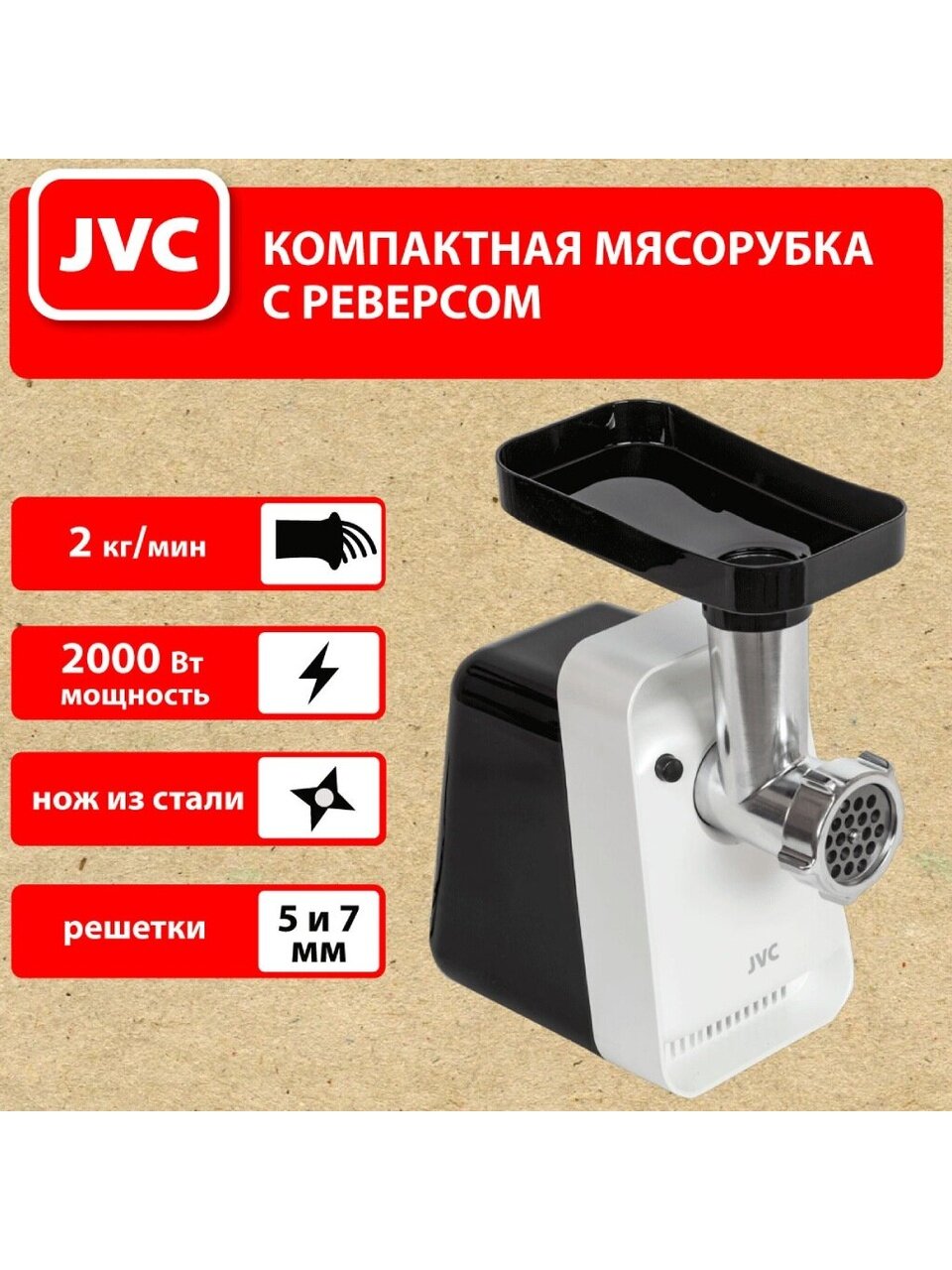 - Электрическая мясорубка JVC быстро справится с поставленной задачей, потому что имеет высокую производительность 2 кг в минуту и мощность 2000 Вт с функцией защиты двигателя от перегрузки.