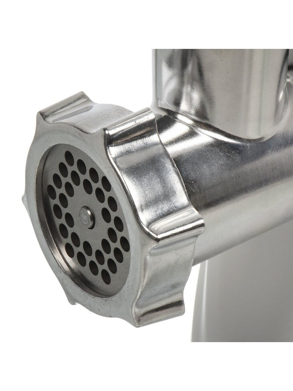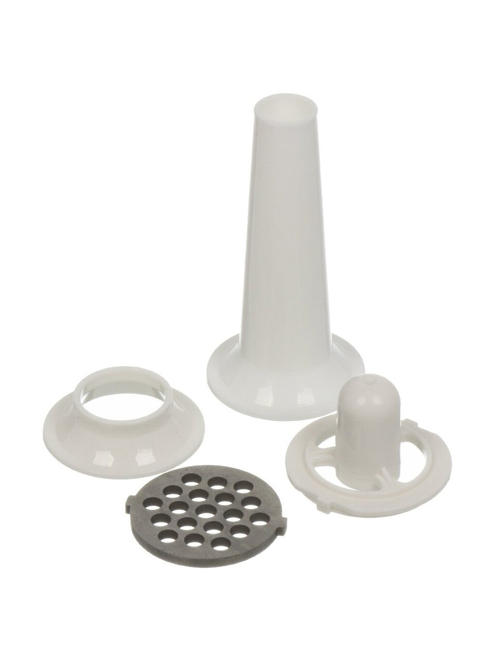В комплекте с мясорубкой идут две решетки 5 и 7 мм, включая насадки для колбасок и кеббе, что дает возможность разнообразить меню и готовить блюда различных кухонь мира. Материал корпуса и лотка выполнен из прочного пластика, что обеспечивает легкость конструкции и простоту в уходе.