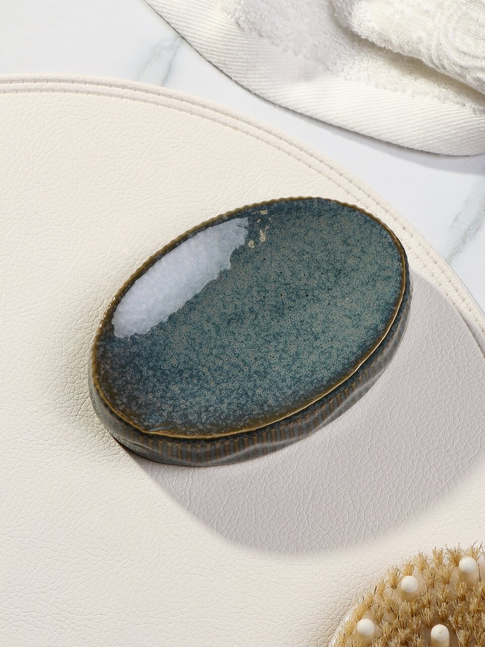 Мыльница настольная из керамики Y4-9842 — стильный голубой перламутр для ванной. Удобно хранит мыло, защищает от размокания, легко очищается, подходит для подарка.