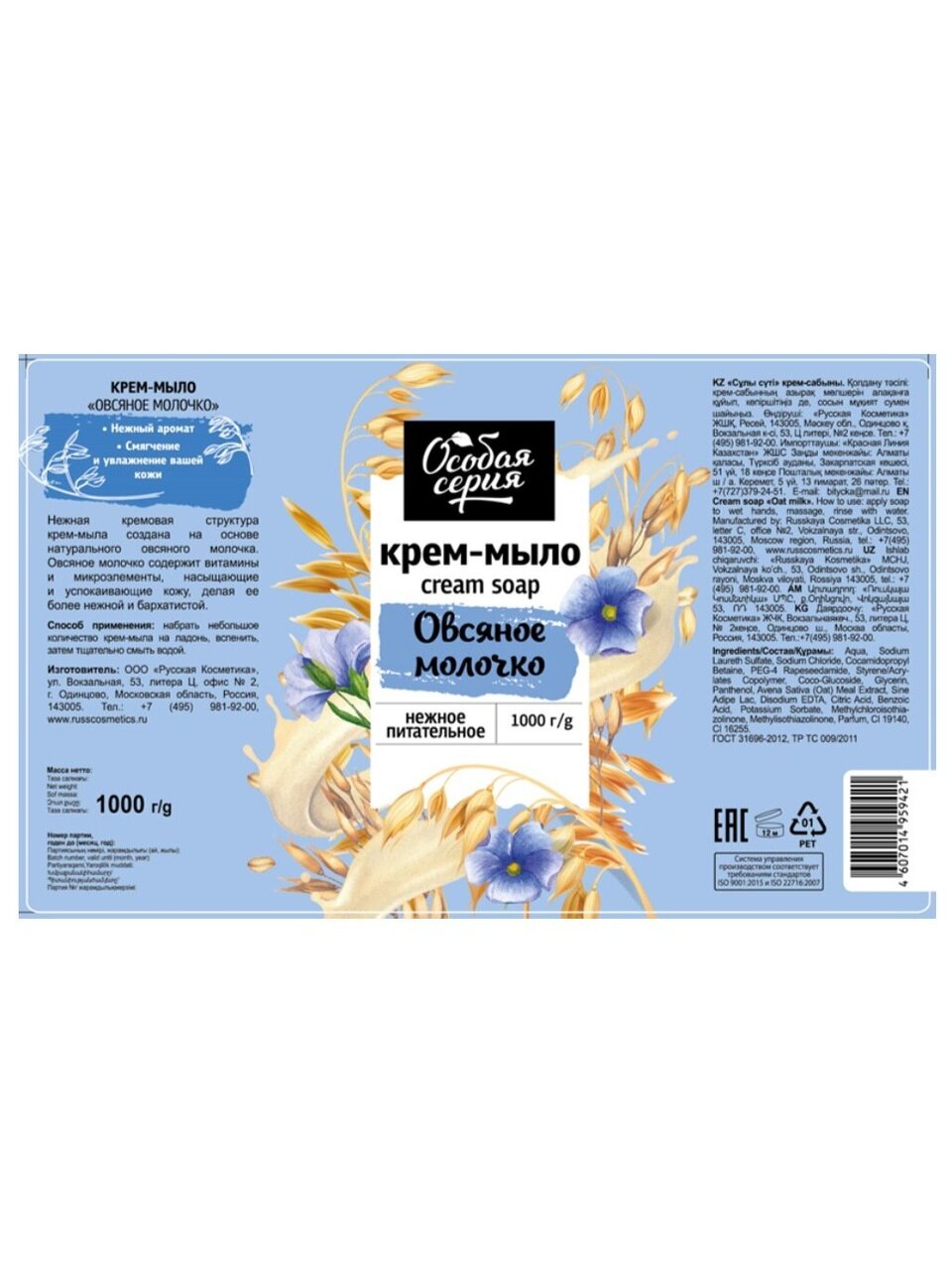 Нежная кремовая структура крем-мыла создана на основе натурального овсяного молочка. Овсяное молочко содержит витамины и микроэлементы, насыщающие и успокаивающие кожу. Крем-мыло бережно очищает кожу, смягчает и питает ее, делая более нежной и бархатистой.