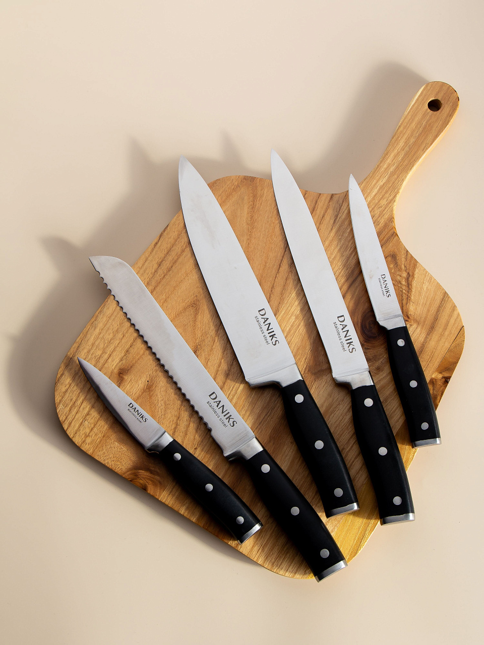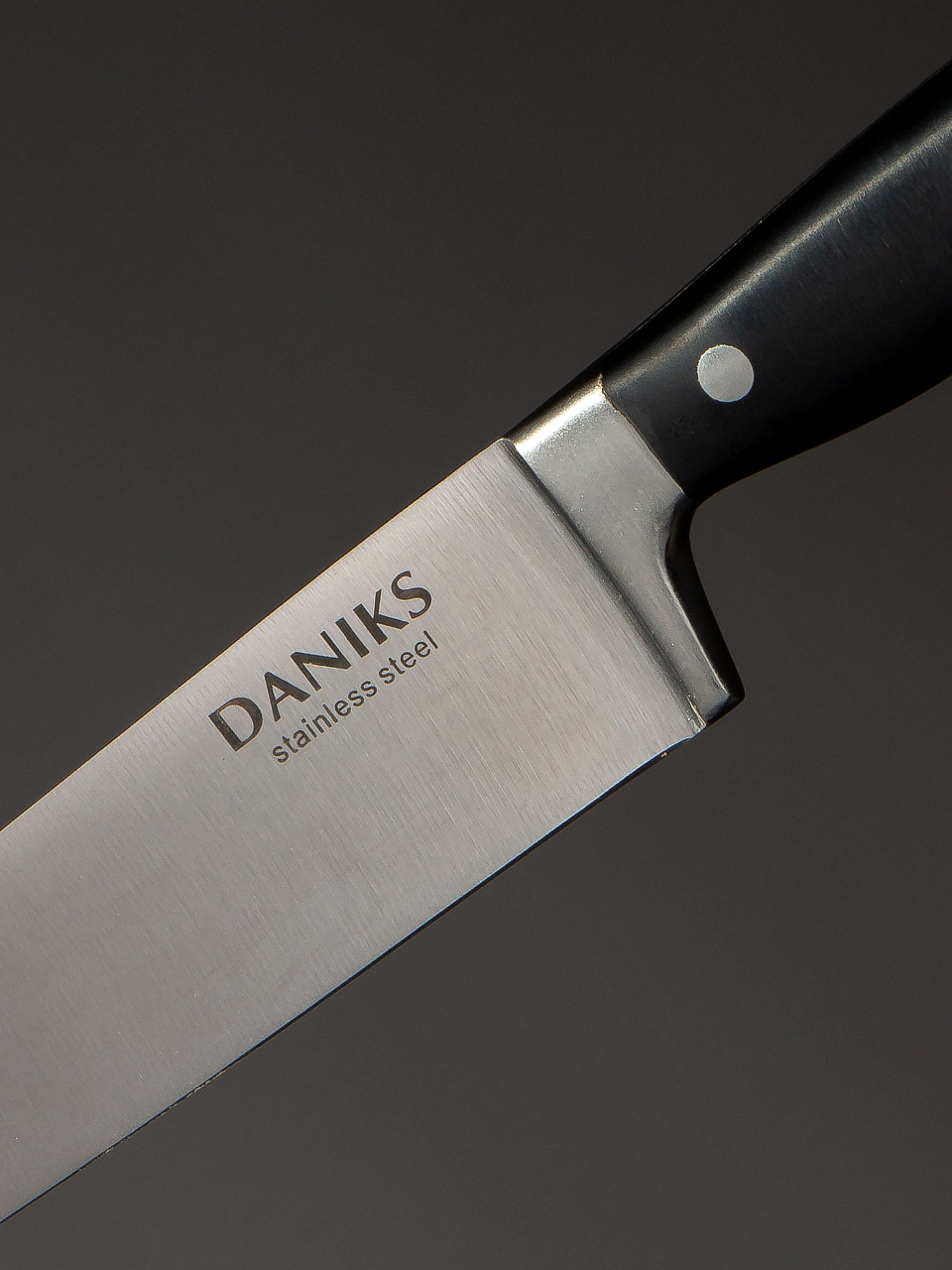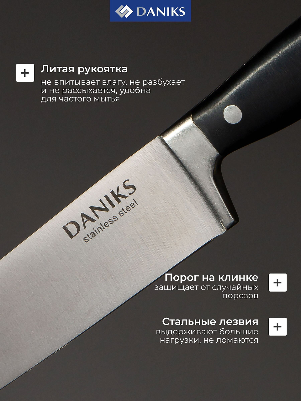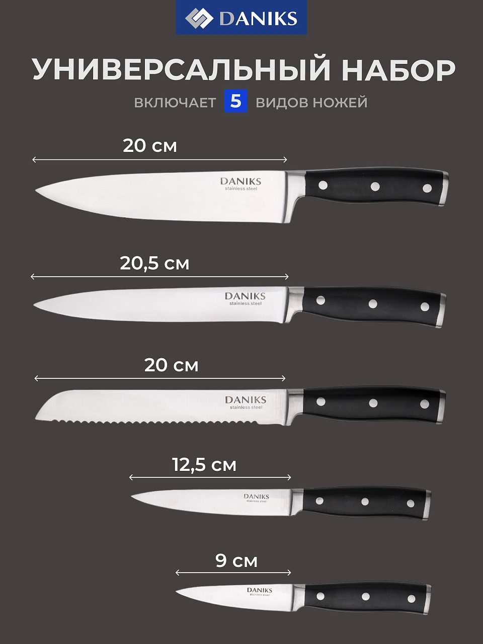 Набор ножей Daniks Black YW-A325 станет отличным выбором для тех, кто ценит качество, функциональность и стильные решения в быту. Сбалансированный комплект позволит справиться с любыми кулинарными задачами — от нарезки хлеба до тонкой шинковки овощей и мяса. Покупка этого набора обеспечит порядок на кухне, сэкономит время на поиске нужного инструмента и подарит удовольствие от процесса приготовления пищи. Продукция бренда Daniks — оптимальное сочетание цены и качества для ежедневного использования дома или на даче.